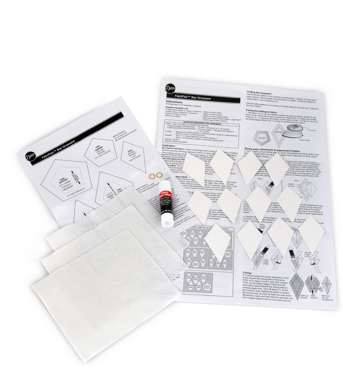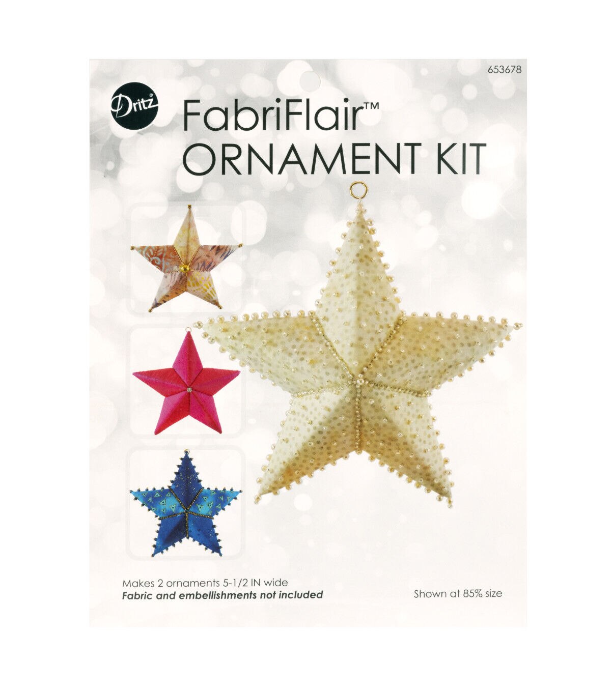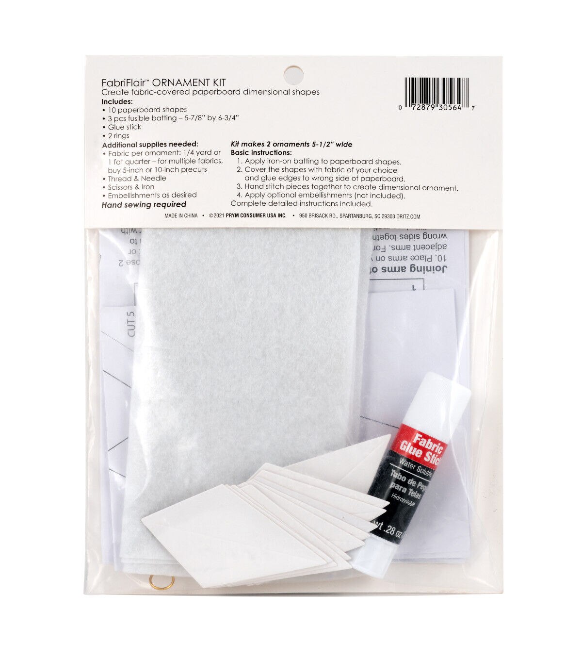 Create beautiful fabric-covered dimensional shapes with the Dritz Fabriflair Star Ornament Kit. Choose your own fabric to cover the paperboard shapes and hand stitch pieces together. The shapes can be embellished with decorative stitching or trims for added flair. This ornament kit includes 10 pre-cut paperboard shapes, three 5.87 x 6.75-inch of fusible batting pieces, a glue stick, two 10 mm rings, an instruction sheet and a pattern sheet.
