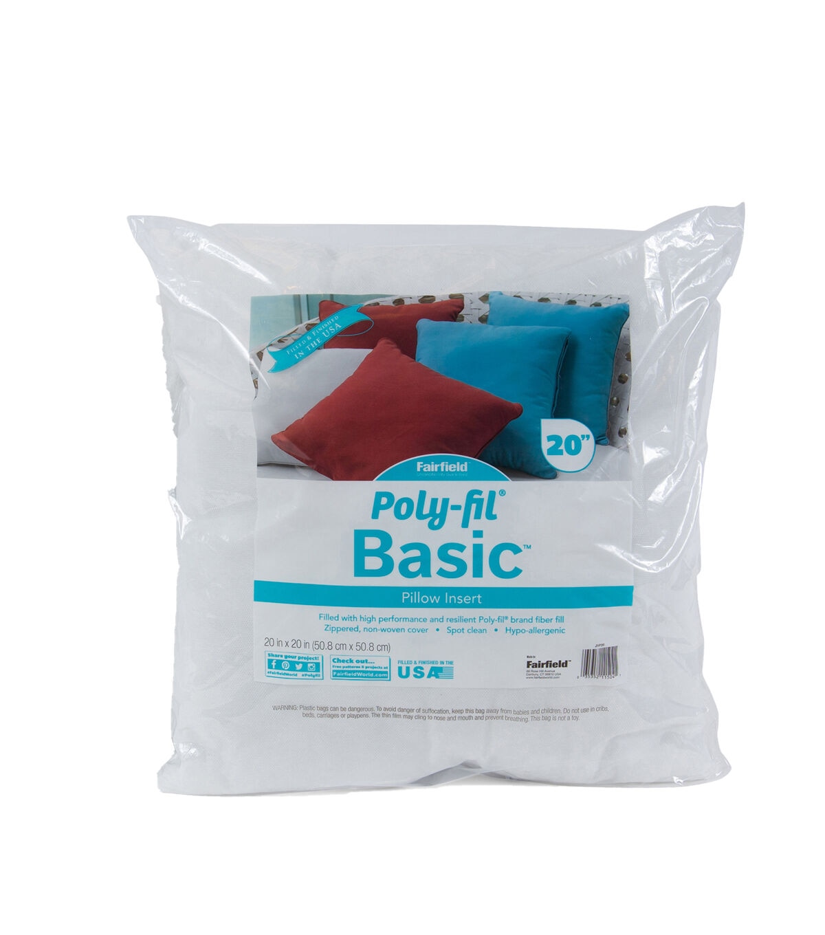 Poly-Fil Basic pillow inserts are a quick, easy, and an inexpensive way to change and refresh the look of a room in your house or use as holiday and seasonal décor. The firm texture allows them to retain their shape when working with the heavier upholstery fabrics or heirloom pieces. Poly-Fil Basic pillow forms are made of 100% polyester fibers with no added chemicals or flame retardants and have a non-woven polypropylene cover. Poly-Fil Basic 20in x 20in inserts are just the right size to use on a bed with a group of throw pillows to create a stunning display. They work great as extra support and comfort along the back of an oversized couch, or to add a splash of color and comfort in a family or child’s room. Pair them with outdoor fabrics for picnics, summer night parties and children’s play. Why not use them to make the car or RV much cozier on those long road trips. For the perfect fit, your pillow cover should be an inch shorter than the pillow size.