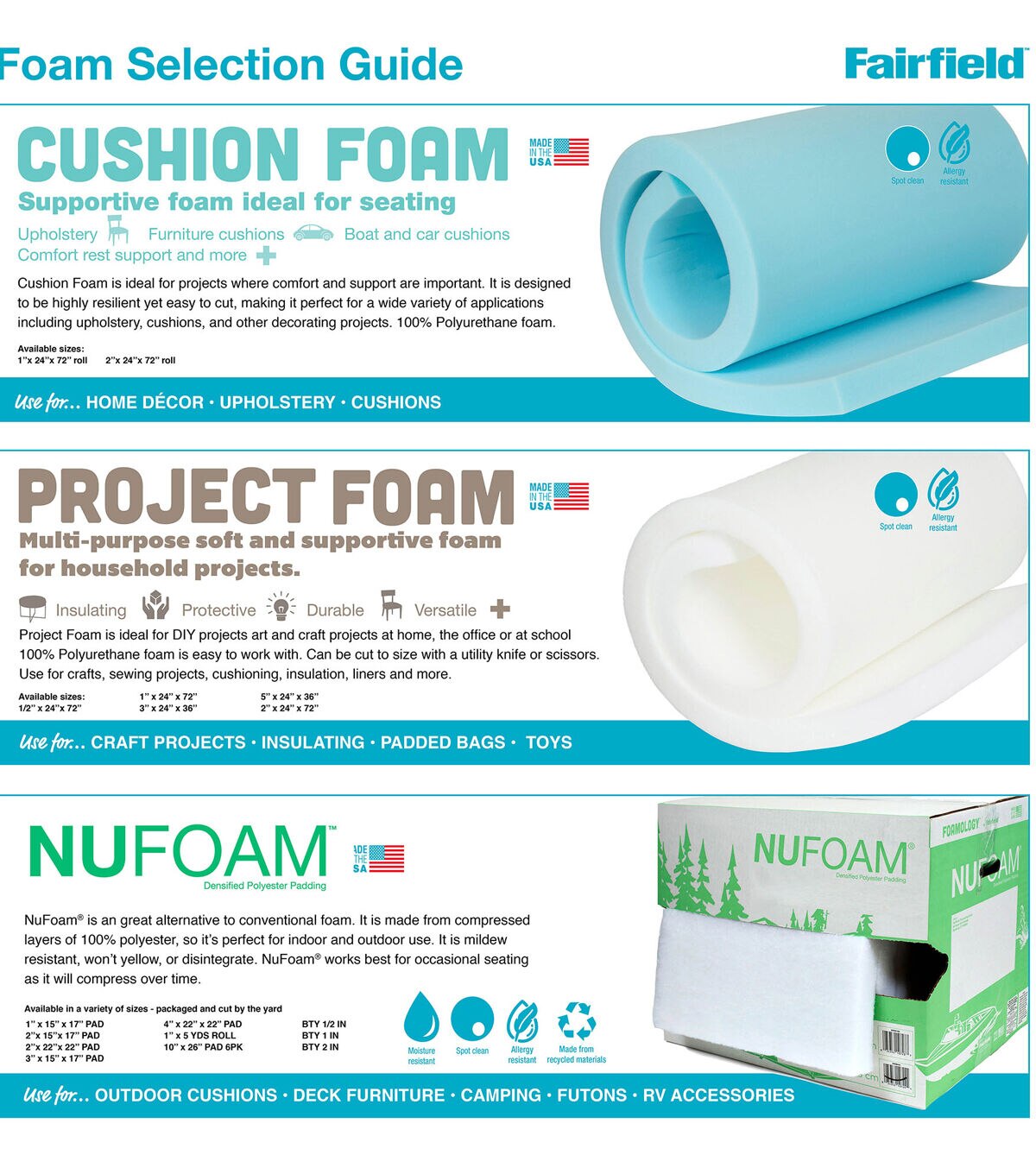 NuFoam is a safe alternative to conventional foam that is made from densified polyester batting.Fairfield's NuFoam won’t yellow or disintegrate. It’s perfect for chair cushions, deck furniture, camping, futons, play mats, recreational vehicle accessories, and more. Made from compressed layers of 100% polyester that range from 1″ to 4″ thick. NuFoam works best for occasional seating as it will compress over time. We recommend using NuFoam that is 1″ thicker than your intended cushion to allow for compression. It will be a snug fit inside the cover. Non-allergenic & Unconditionally guaranteed.