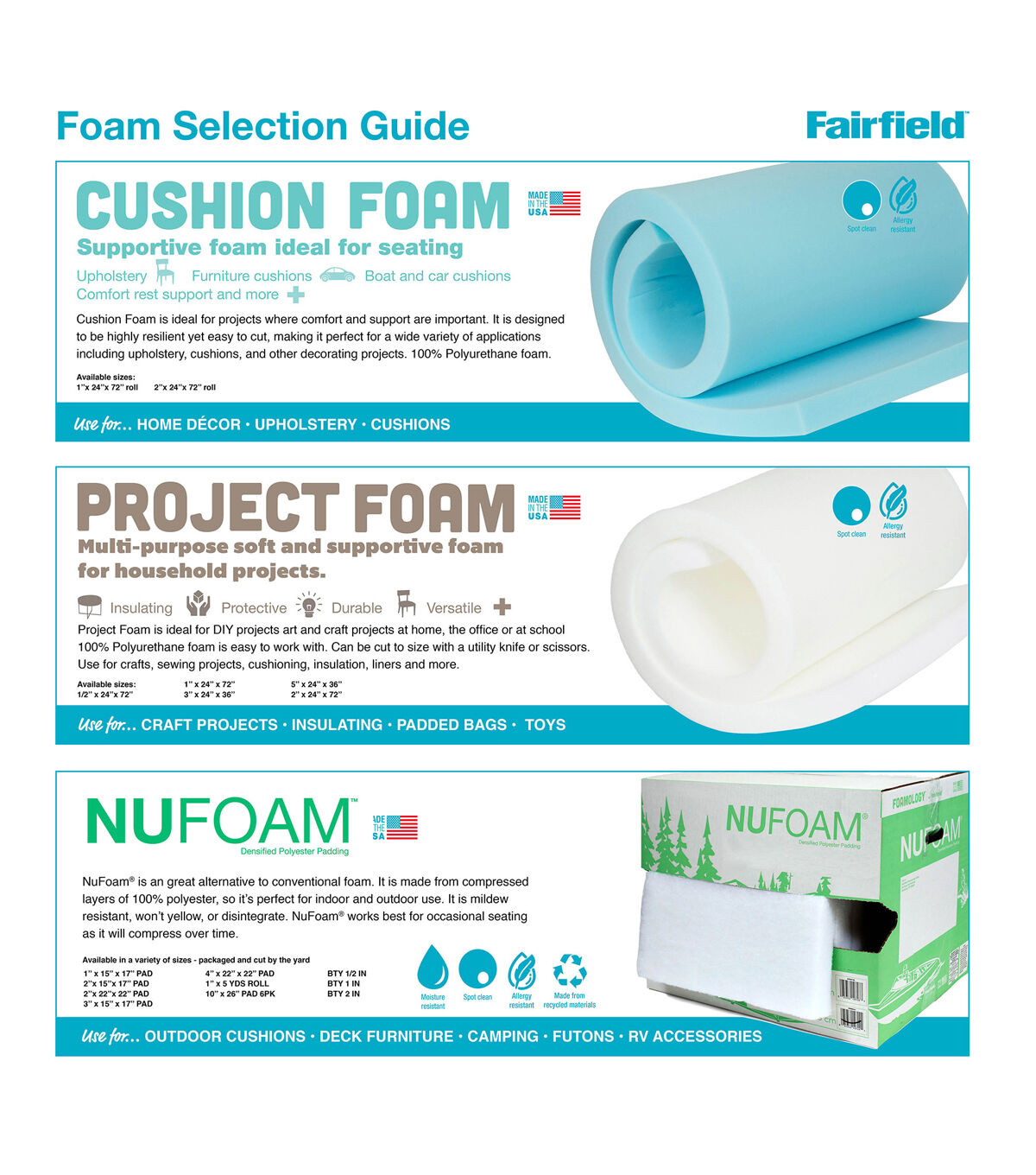 NuFoam is a safe alternative to conventional foam that is made from densified polyester batting.Fairfield's NuFoam won’t yellow or disintegrate. It’s perfect for chair cushions, deck furniture, camping, futons, play mats, recreational vehicle accessories, and more. Made from compressed layers of 100% polyester that range from 1″ to 4″ thick. NuFoam works best for occasional seating as it will compress over time. We recommend using NuFoam that is 1″ thicker than your intended cushion to allow for compression. It will be a snug fit inside the cover. Non-allergenic & Unconditionally guaranteed.