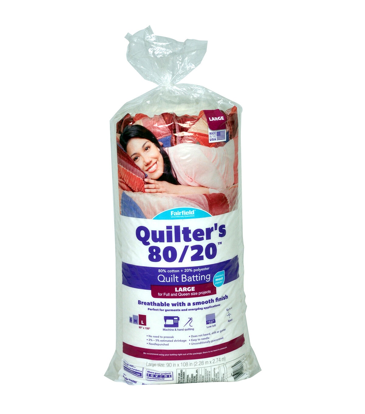 Quilter's 80/20™ is a super-soft, needlepunched quilt batting that is preferred by hand quilters because it is very easy to needle and shows stitching definition. Machine quilters love the 80% cotton and 20% polyester blend because machine needles glide through it with ease, and it’s light and airy creating a beautiful drape. The cotton helps create that favored flat traditional look making it the ideal batting for light-weight, year round quilts and throws. The added polyester helps to reduce shrinkage and wrinkles also making it great for clothing and wall hangings. Lightly misted with a polyester bonding with no scrim. Low loft around 1/8” with a quilting distance of 2" - 4", no need for pre-soaking. The 90" x 108" Queen Size is the ideal size for queen beds, duvets and comforters.