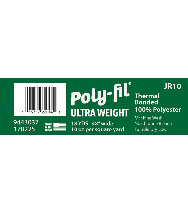 Poly-Fil Ultra-Weight 100% bonded polyester quilt batting is appropriate for hand, machine & tied quilting. This batting can also be used to wrap cushions when reupholstering to provide a smooth finish, rounded edges on couches, sofas, chairs, stools, headboards, window seating, and more. Perfect for DIY projects used by quilters, upholsterers, seamstresses, designers and artists.
