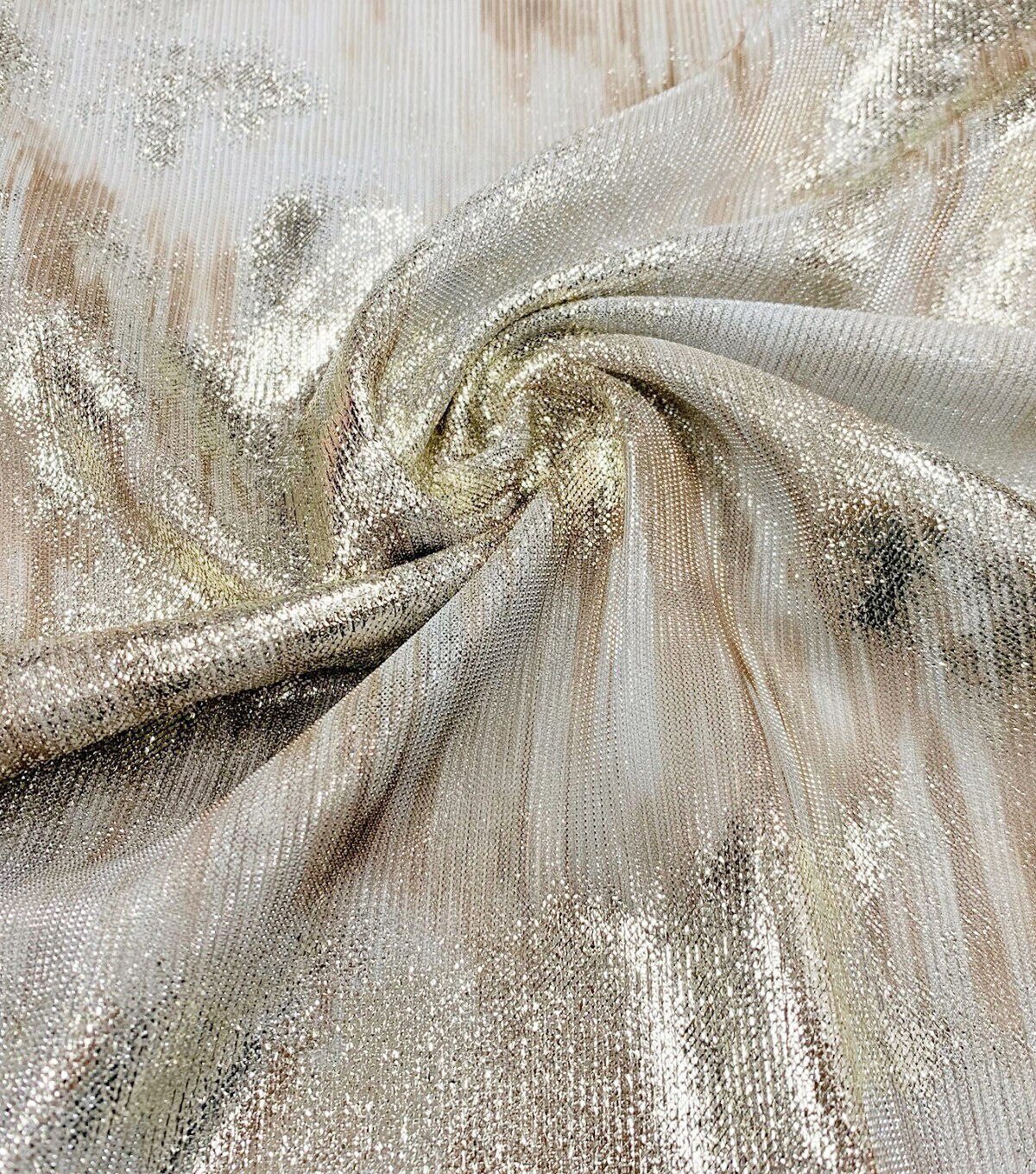 Go for gold with this cosmic metallic knit for an artistic aesthetic. This fabric is a metallic-polyester blend for a lustrous shine that packs durability and breathability. That way you can stay comfy and fancy in formalwear without worry over the wear and tear. From exciting prom dresses to glamorous nights out with friends, grab this fabric for you and your sewing to look your best.