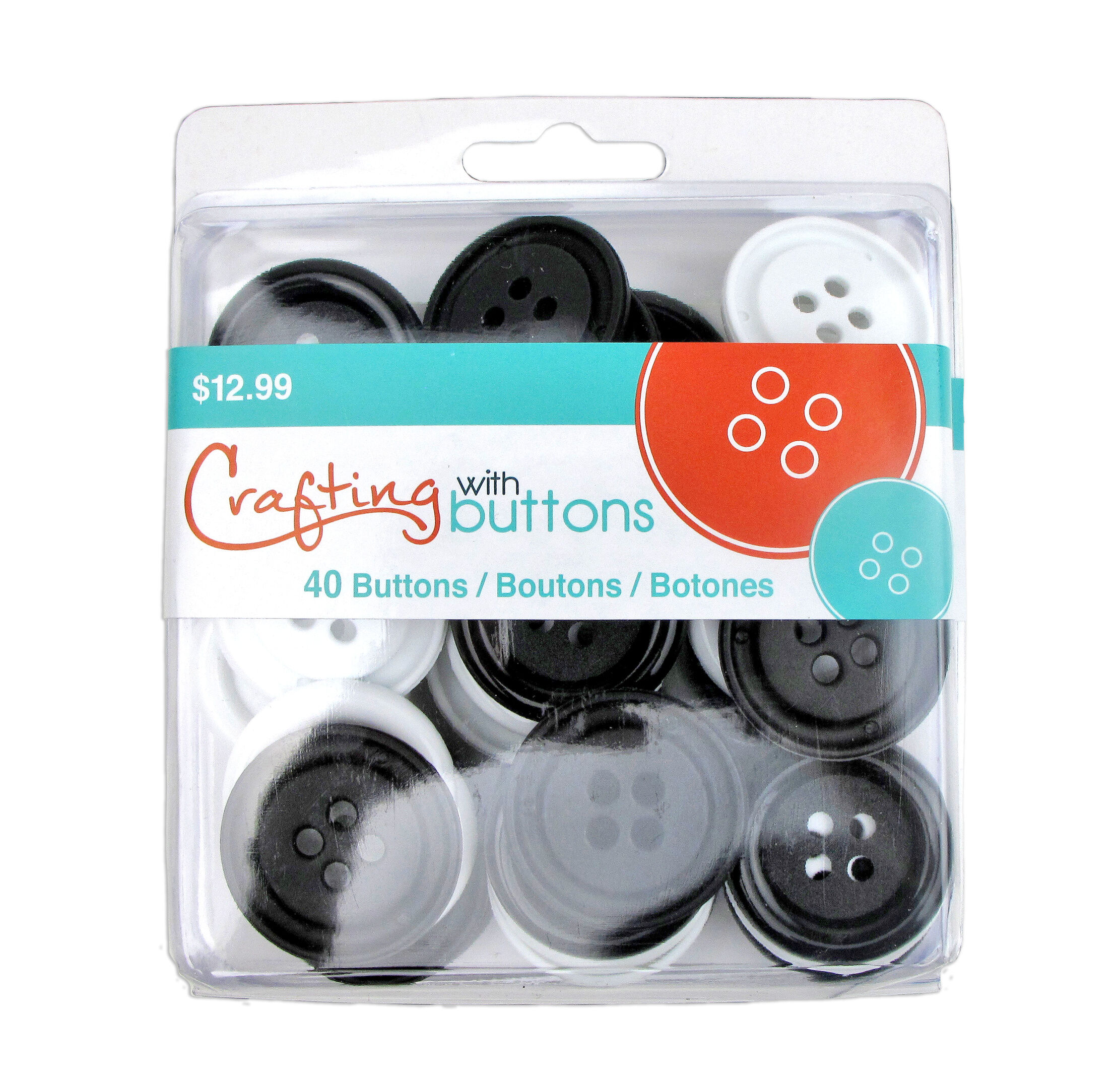 The Black & White Big Button Clamshell contains 40 buttons, they are all four hole sew through buttons. The size is 1 3/8" and the colors are black and white. These buttons are great for craft or sewing projects. They are perfect for teaching your kids how to sew. The large size makes it easy for them to hold and they are sure to stand out and get noticed.