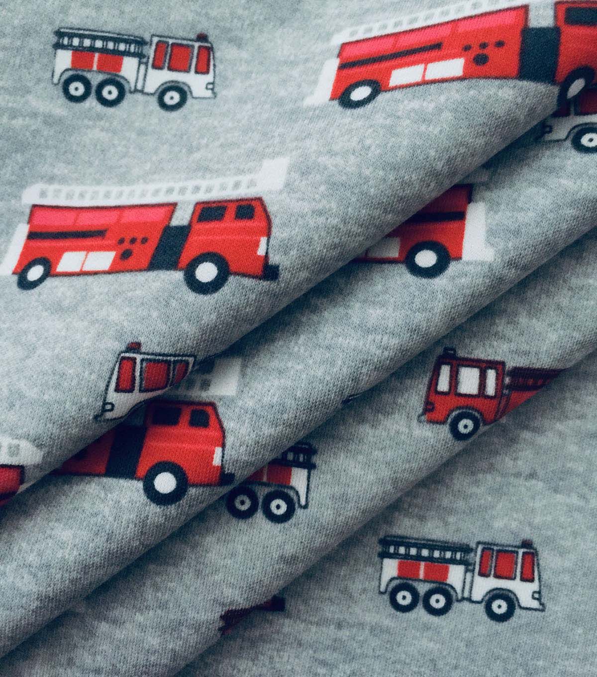 • Firetrucks on Gray Interlock Knit Fabric by POP!