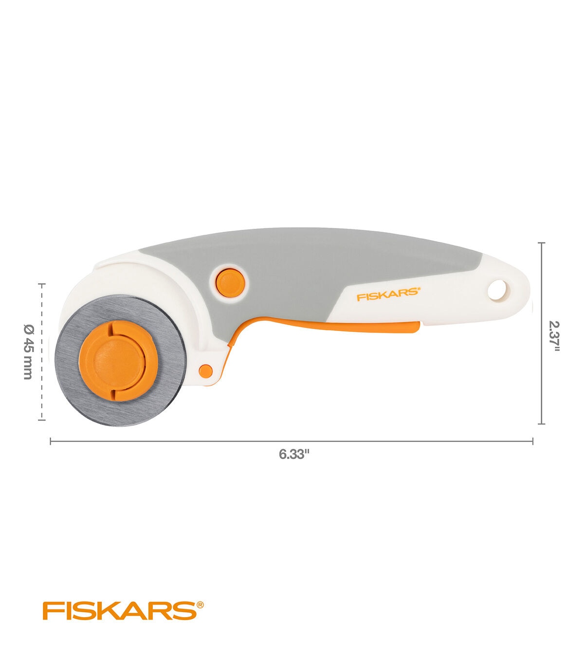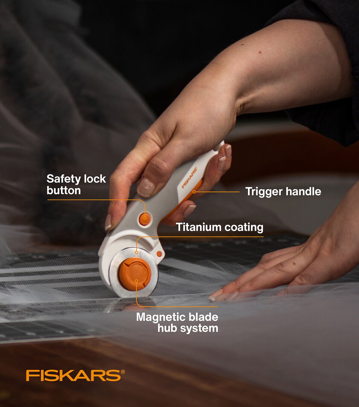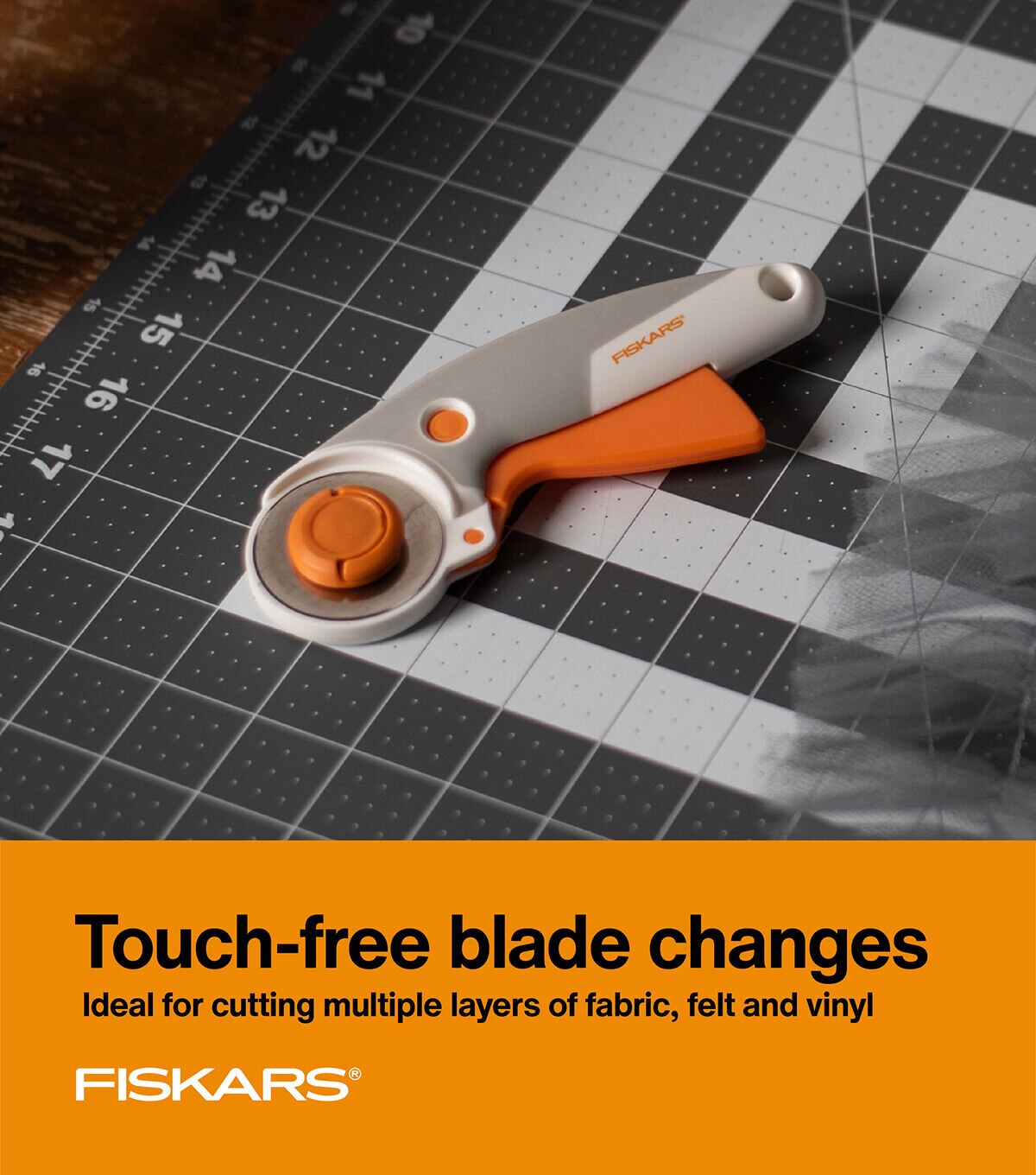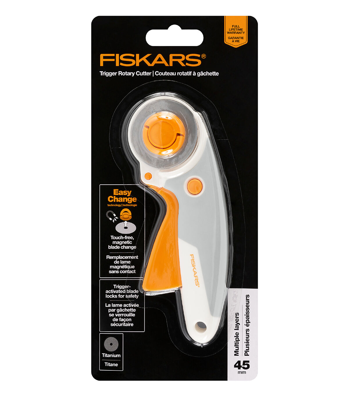 - Fiskars Easy Change Trigger Rotary Cutter, 45 mm features a magnetic blade hub system for safer, easier and quicker blade replacement