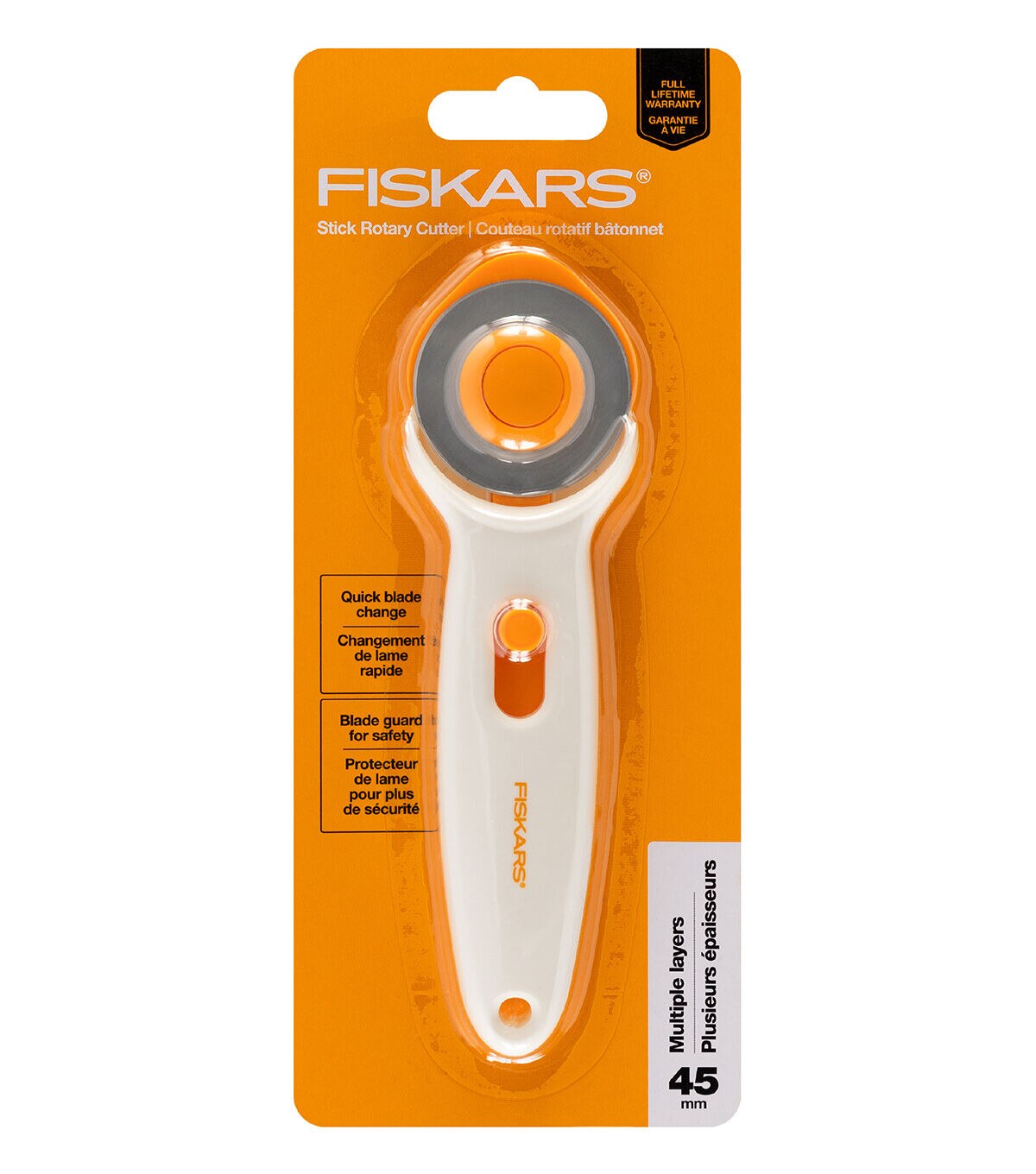 Ideal for cutting multiple layers of fabric, felt and vinyl, Fiskars Stick Rotary Cutter (45 mm) features a high-grade, precision-ground, 45 mm premium steel blade for long-lasting sharpness. A sliding button extends the blade guard for secure storage and protection when not in use. Blade changes are faster and easier thanks to fewer loose parts. This rotary cutter’s symmetrical, ambidextrous design allows for controlled, easy freehand cutting with either the left or and right hand, and it offers optimal blade exposure for use at multiple cutting angles.
