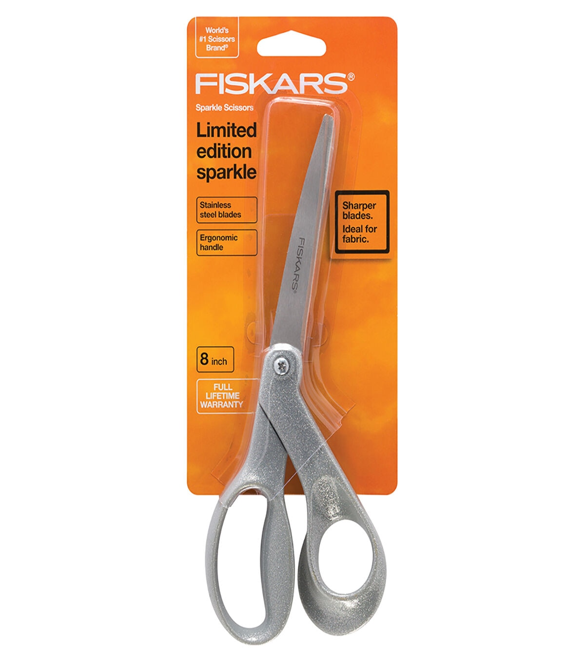 Enjoy legendary performance and a glamorous take on The Original Orange-handled Scissors with Fiskars Glitter Scissors. Every sewer and quilter are looking for premium performance from their scissors, even if orange isn’t their preferred color. That’s why Fiskars has created scissors that incorporate all the essential features of The Original Orange-Handled Scissors with fashionable glitzy, silver glitter bent handles. High-grade stainless-steel blades feature a precision-ground edge that stays sharp longer and cuts all the way to the tip, an essential feature for anyone who cuts fabric. A lightweight design and ergonomically sculpted handle provide unmatched cutting control, and a bent handle design keeps materials flat for precise cuts every time.