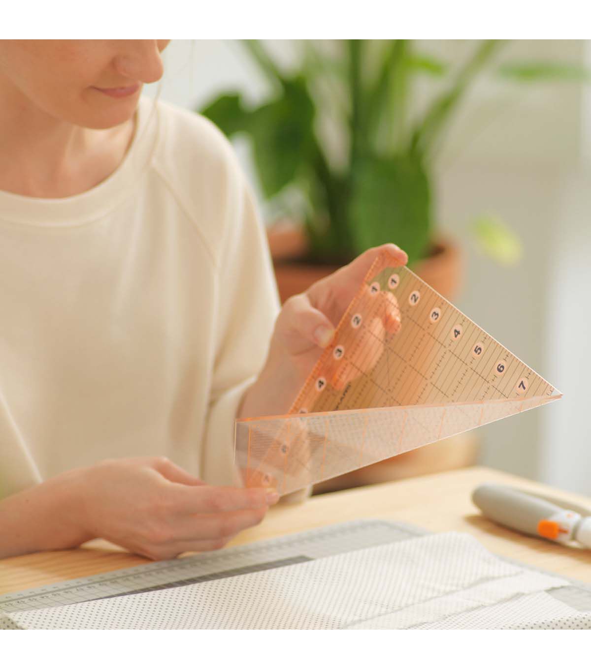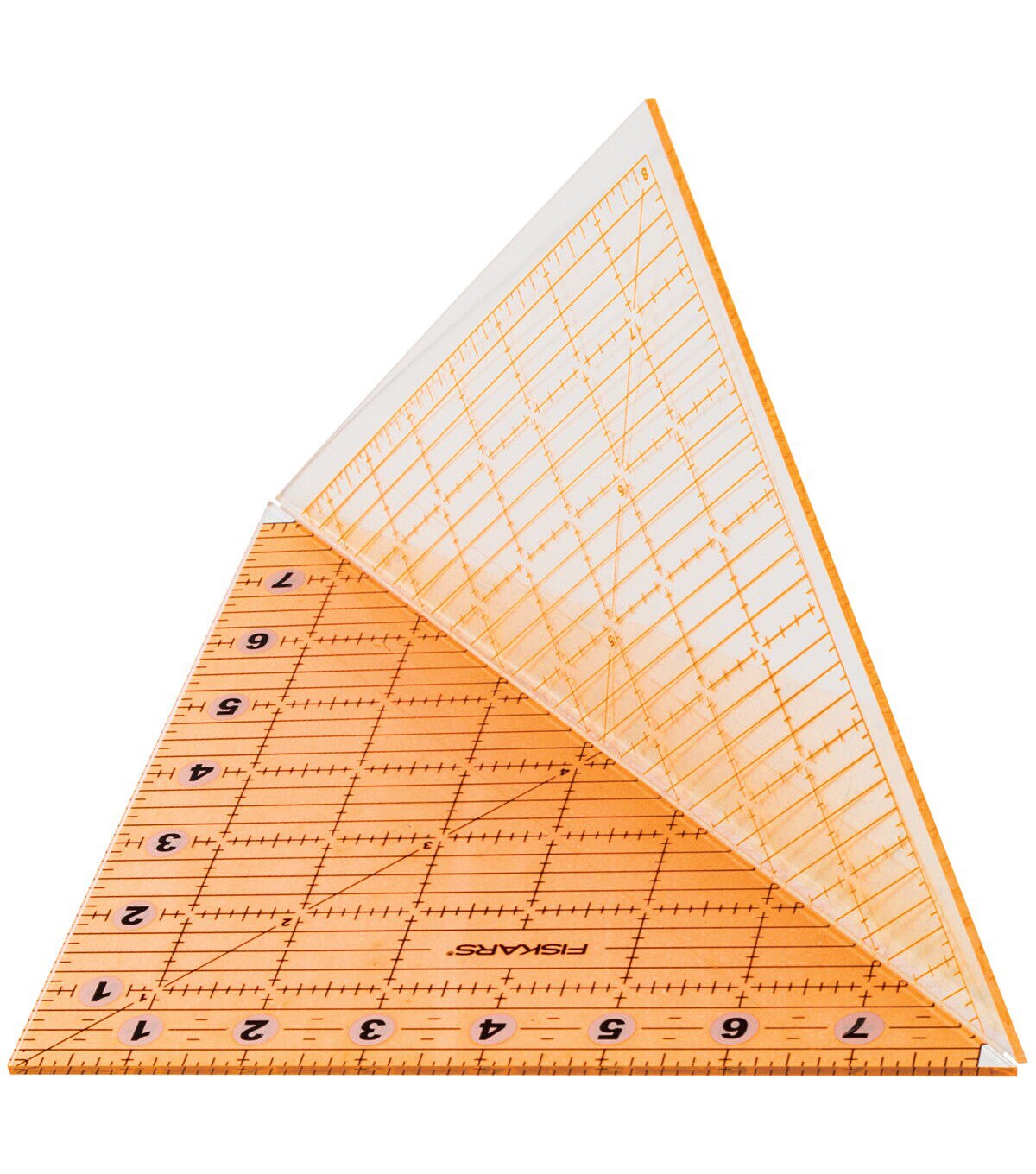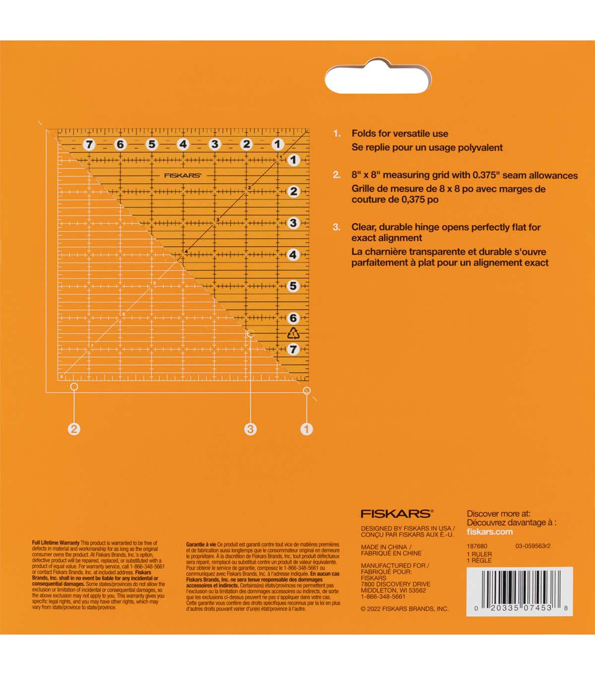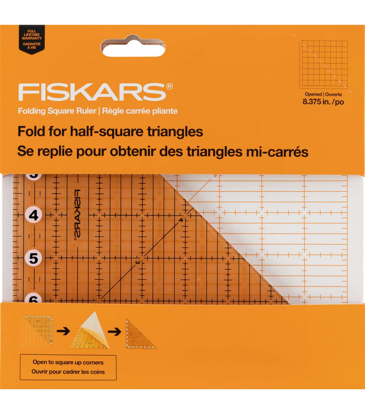 Fiskars-Folding Ruler. Folds into a triangle for versatile measuring! Ideal for cutting squares and triangles from 1 inch to 8 inches. Made of 2.4mm thick, premium quality clear acrylic for lasting durability.