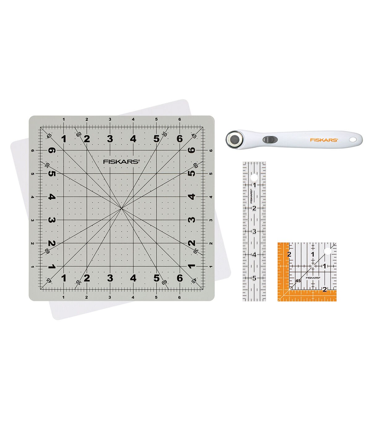 Fiskars 4-piece Detail Fabric Cutting Set puts everything you need to make intricate cuts in one place. The slender 18 mm blade on our Classic Stick Rotary Cutter is perfect for accurate, freehand cutting of complex patterns, tight curves and quilting appliqué pieces, while our compact 8” x 8” Rotating Cutting Mat features a rotating design that lets you trim small quilt blocks or easily cut out appliqué pieces. The set comes complete with easy-to-read Acrylic and Square Acrylic Rulers, for quick, precise measuring – a great, compact, all-in-one kit for any small fabric cutting task or detailed project.