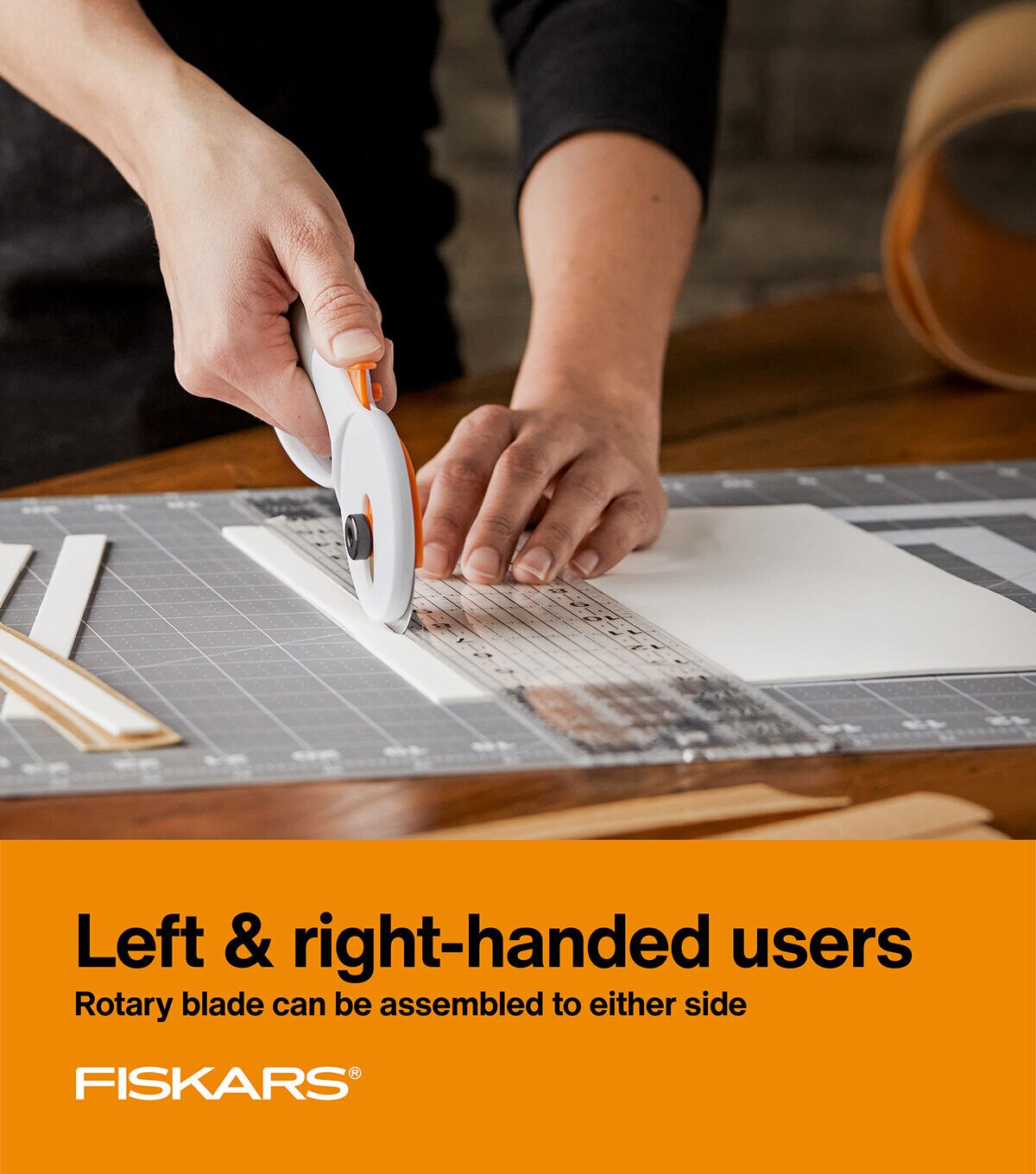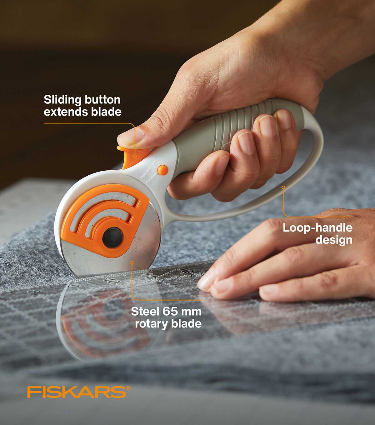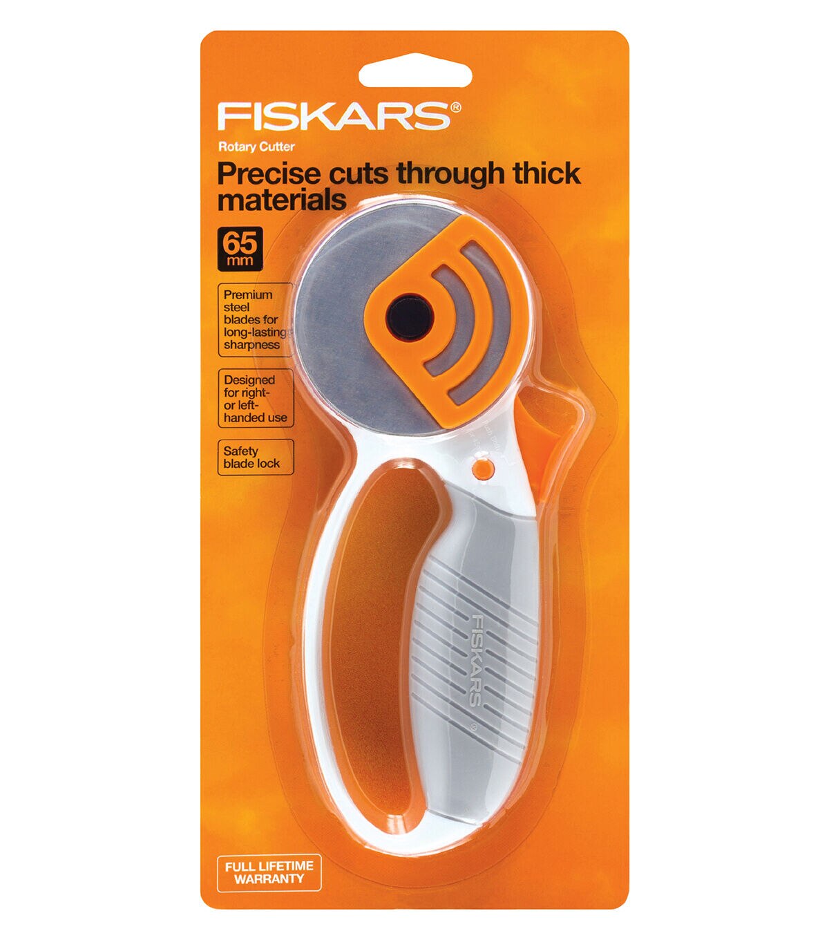 - • Fiskars Heavy-duty Comfort Loop Rotary Cutter features a premium steel 65 mm rotary blade for long-lasting sharpness
