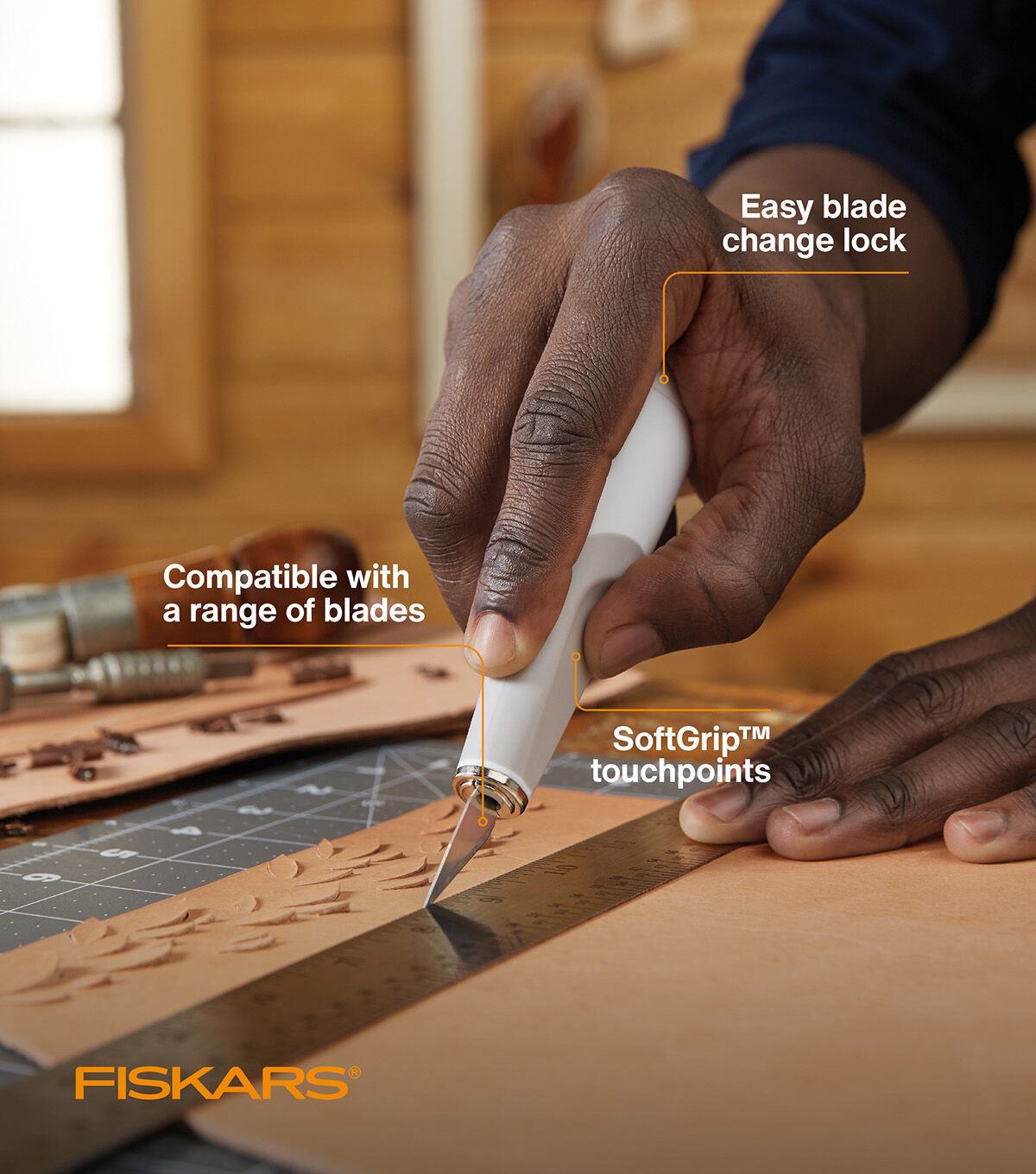 Thoughtfully designed for the way you like to work, the Fiskars DIY Heavy-duty Easy Change Detail Knife boasts the perfect combination of power, comfort and versatility. A great choice for cutting matte board, foam core, plastic, cardboard, wood and more, this knife features an easy blade change lock that allows you to switch blades in seconds. Stay in control during exact cuts with a durable, contoured, ergonomic handle that’s sculpted to fit your grip. In addition, Softgrip touchpoints improve comfort and control. Compatible with an impressive range of heavy-duty blades, this versatile knife ensures you can always use the blade that’s right for your materials and project. This knife includes one #2 heavy-duty, angled chisel blade. It is also compatible with #15, #18, #19, #22, #25, #27 and extra-fine serrated saw blades.