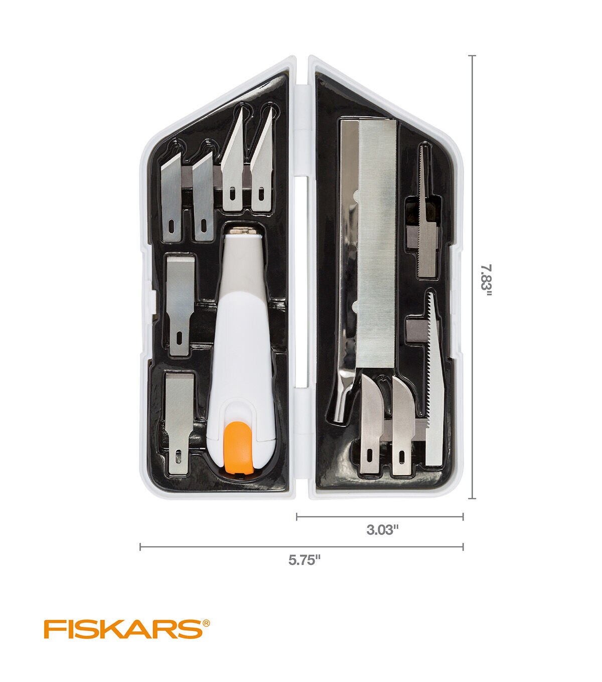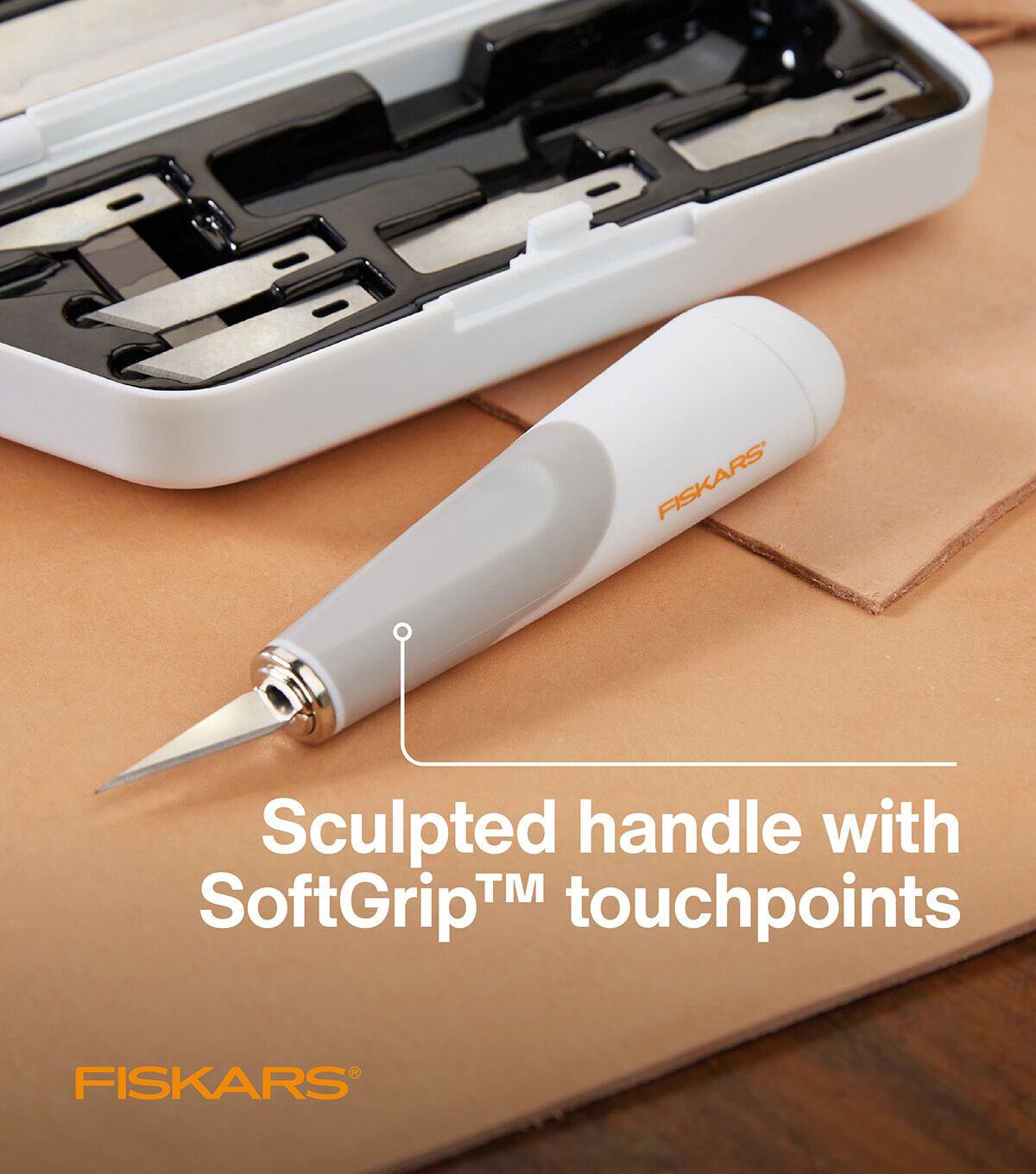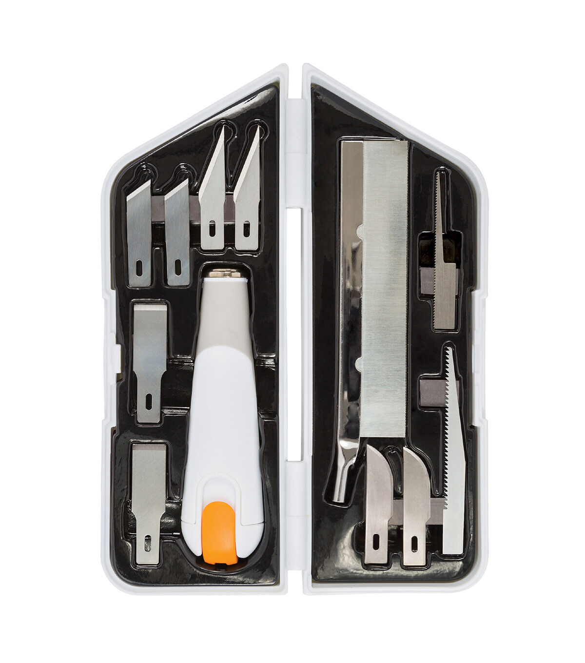 Thoughtfully designed for the way you like to work, Fiskars Heavy-duty Easy Change Detail Knife Set, boasts a combination of power, comfort and versatility. A great choice for cutting matte board, foam core, plastic, Styrofoam, wood, cardboard, EVA foam sheets & dowels and more, the knife features an easy blade change lock that allows you to switch blades in seconds. Stay in control during exact cuts with a hefty handle that’s sculpted to fit your grip. In addition, Softgrip touchpoints improve comfort and control. The kit comes in a convenient plastic case stocked with seven different blade styles, and a total of 11 blades, ensuring that you always use the blade that’s right for your materials and project.