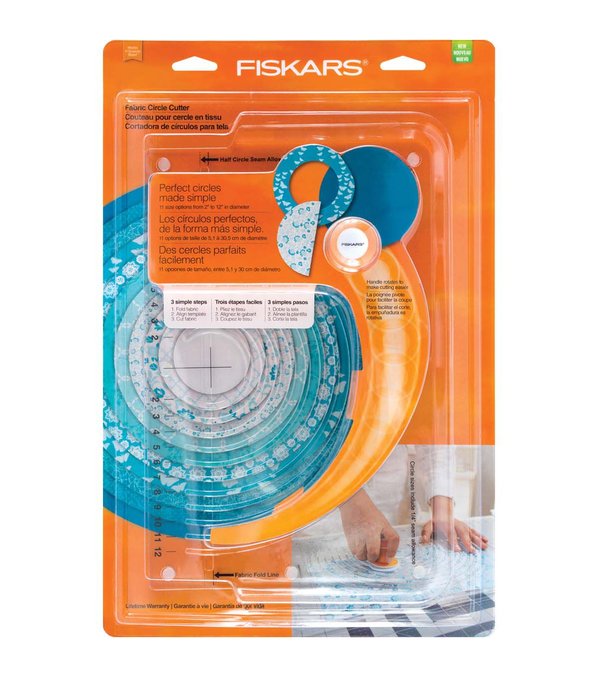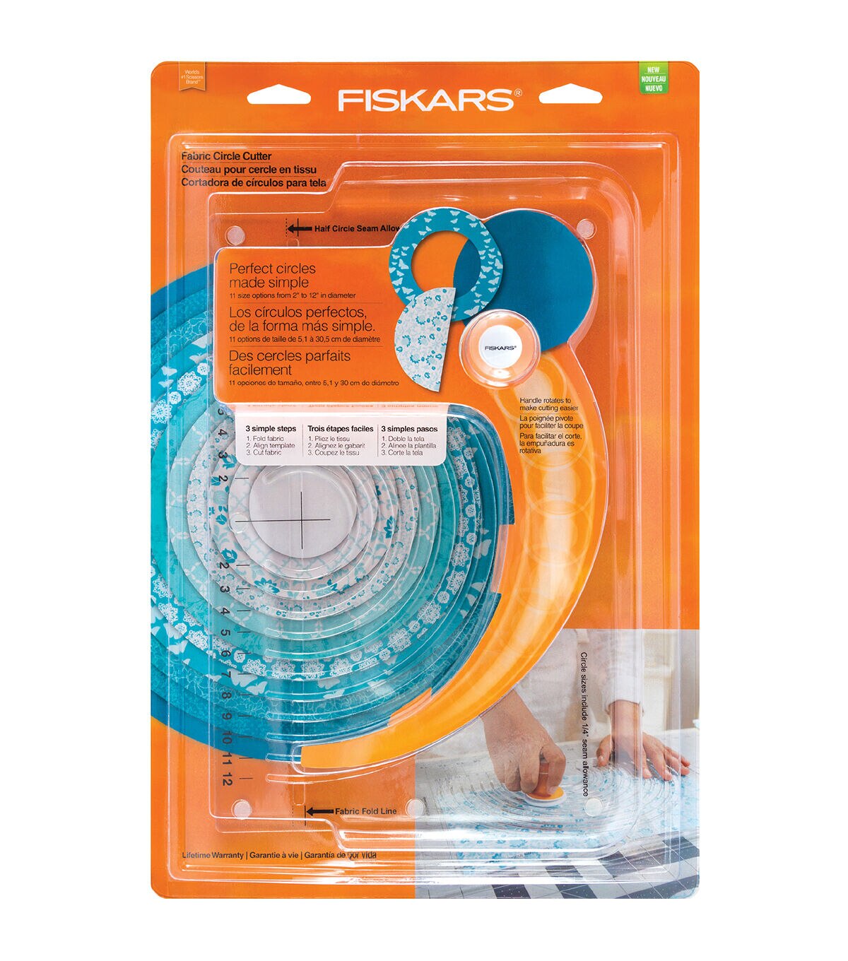 Perfect circles are simple with a design that eliminates bumpy freehand cutting, tracing and pinholes. The Fabric Circle Cutter helps you cut clean, consistent circles and frames without tracing or wobbly freehand cutting. A convenient push cutter glides smoothly along the template’s tracks for circles from 2" to 12" in diameter. Its rotating handle allows you to make the entire cut without twisting or reaching, while cushy Softgrip helps boost comfort. A built-in 1/4" circle seam allowance and an optional 1/4" half-circle seam allowance add convenience. To cut a circle, simply fold fabric in half and place the template on top, aligning the template’s bottom lip with the folded edge. Position the cutter in one of 11 tracks, press down to expose the blade and then run it along the track for an impeccable circle without rough edges, bumps or holes.