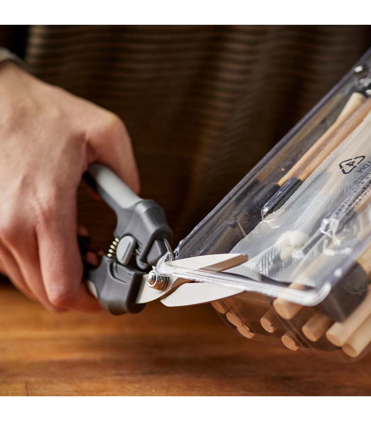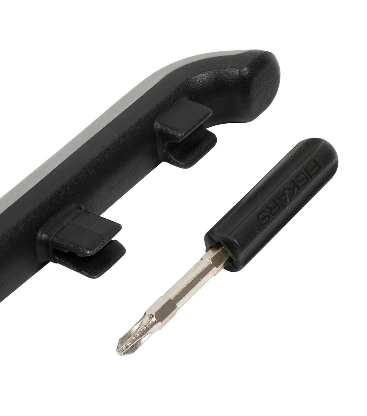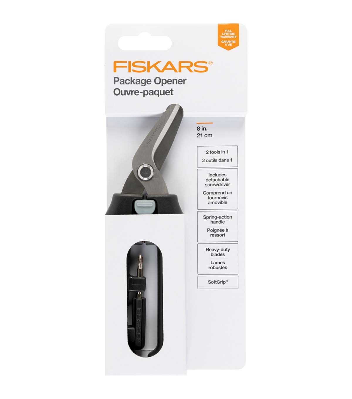 Beat "wrap rage" with a tool that makes opening packaging quick and easy! An essential tool for parents on holidays and birthdays, Fiskars Package Opener makes it easy to open virtually any type of packaging in moments so the gift inside can be enjoyed immediately. Sharp, heavy-duty blades cut all the way to the tip and snip cleanly through virtually any type of packaging. Additionally, the blades feature a longer design than most hardware snips to help you cut hard-to-reach zip ties or cut at awkward angles. An offset handle helps keep your hands away from the sharp edges of freshly cut packaging, and a spring-action design with Softgrip reduces hand fatigue while cutting. A combination of scissors and phillips screwdrive all-in-one, the Fiskars Package Opener even includes a pair of small screwdrivers for opening battery compartments.