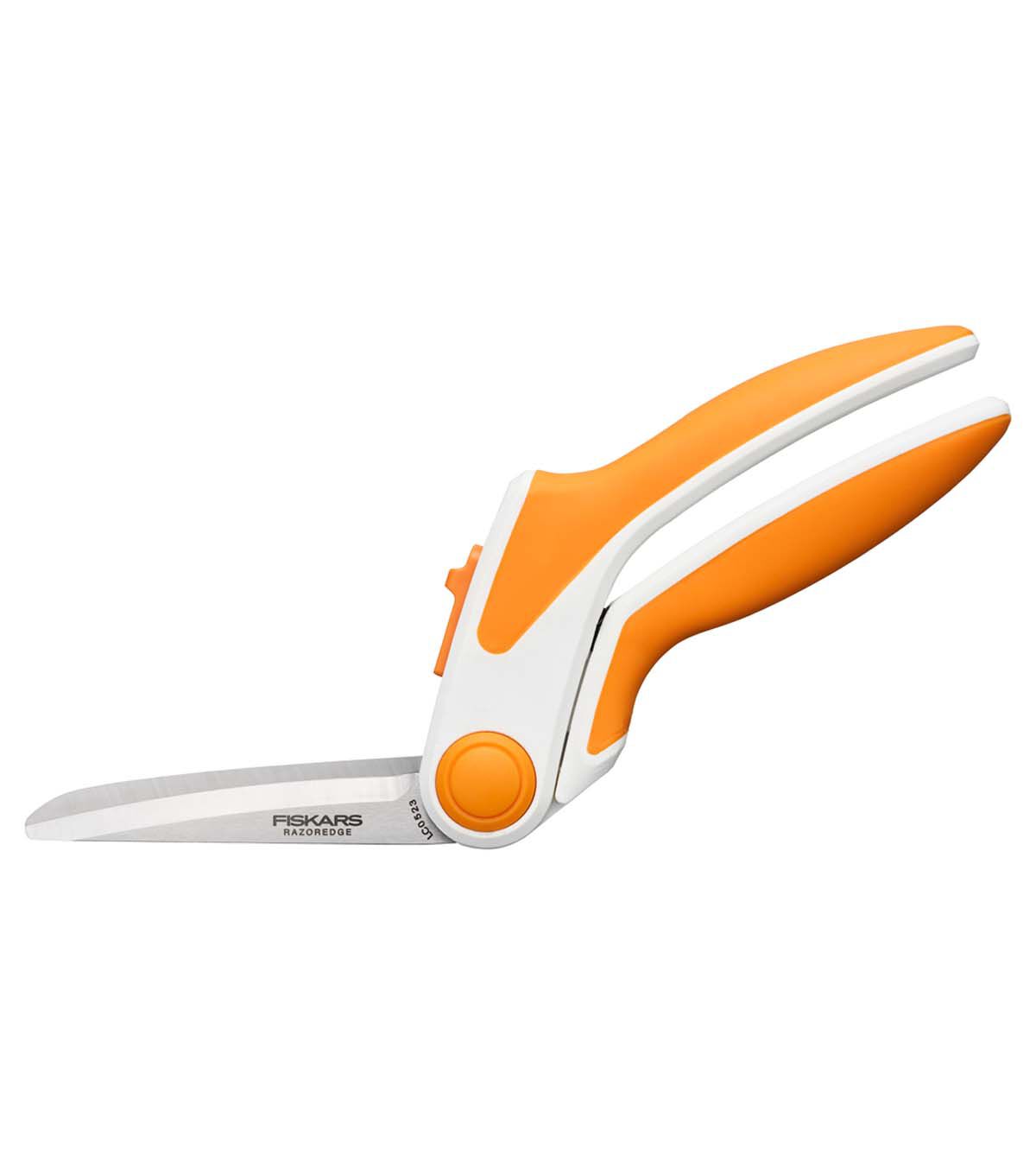 Fiskars 8” RazorEdge Easy Action Fabric Shears feature high-grade, stainless steel blades, precision-honed to an ultra-sharp edge to make sure every cut is crisp and clean. The blades are also tested to cut all the way to the tip — essential for anyone who cuts fabric. Winner of the Arthritis Foundation Ease-of-Use Commendation, these shears feature an Easy Action design to limit hand fatigue. The shears feature a spring-action design that opens the blades after each cut, greatly reducing the effort needed. Fiskars unique handle design helps keep fabric flat on the table while you cut for precise, mistake-free cuts. Additionally, a contoured handle with Softgrip touchpoints provides a secure, comfortable grip, while an easy-open lock helps protect the blades during transport and storage.