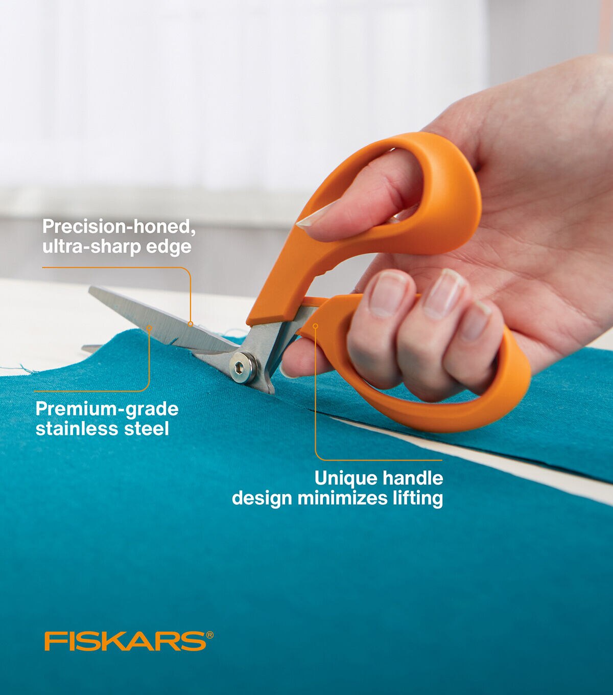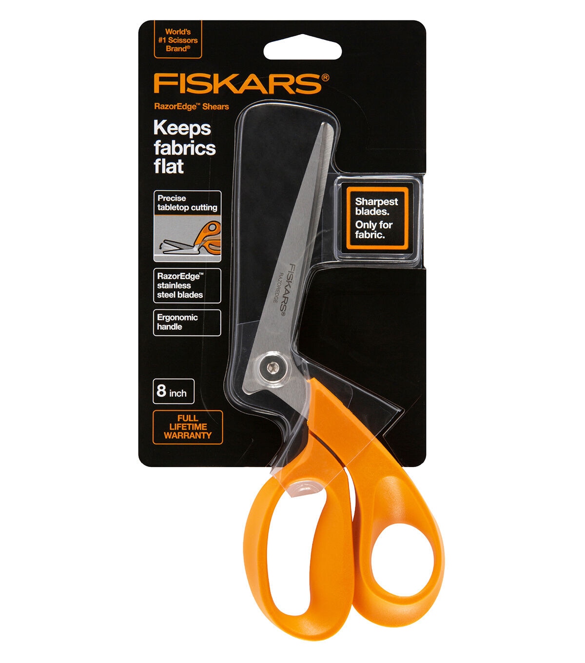 Perfect for a wide range of sewing and quilting tasks, Fiskars 8 in. RazorEdge Fabric Shears for Tabletop Cutting feature premium-grade, stainless steel RazorEdge blades, precision-honed to an ultra-sharp edge to ensure every cut is crisp and clean. A unique handle design helps keep fabric flat on the table while you cut for error-free cutting precision, while sculpted finger and thumb loops provide excellent comfort and control. An advanced pivot design provides ultra-smooth cutting action, and an included sheath helps protect the blades when not in use.
