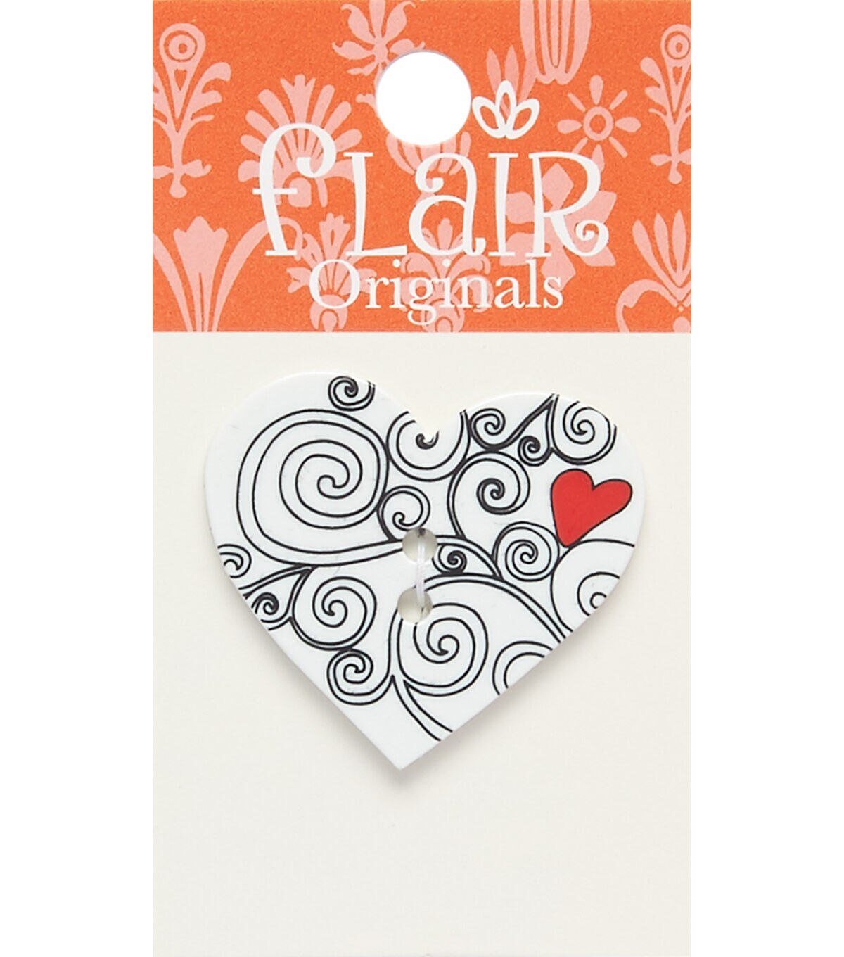 Add a fun twist to your apparel designs with the Flair Originals 2 Hole Heart Button - Black & White. It is shaped like the heart and displays a whimsical print in black and red, and is perfect to embellish any of your sewing projects. This sew-through button can also be used to decorate a handmade card or scrapbook cover.