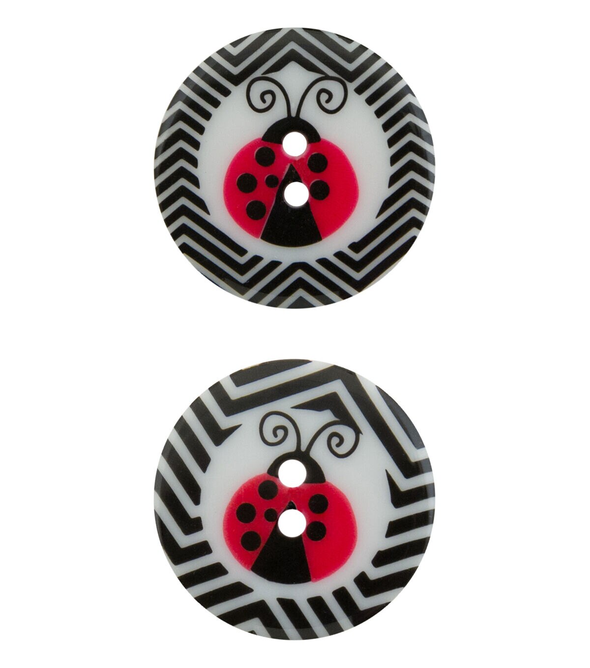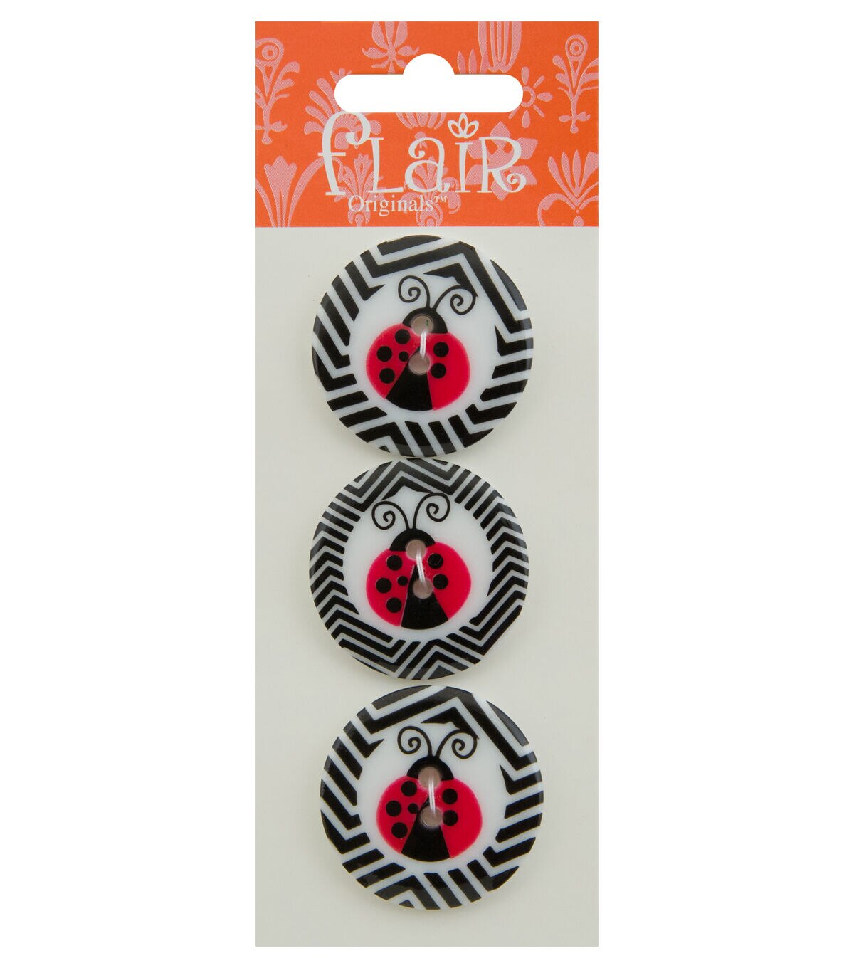 Add a whimsy touch to your sewing and craft projects with the Flair Originals 2 Hole Round Buttons - Ladybugs. These buttons sport a ladybug print at the center, surrounded by stripes in black. You can sew them on your little one's dress, skirt, tee, top or more for a striking appeal. This pack comes with three buttons.