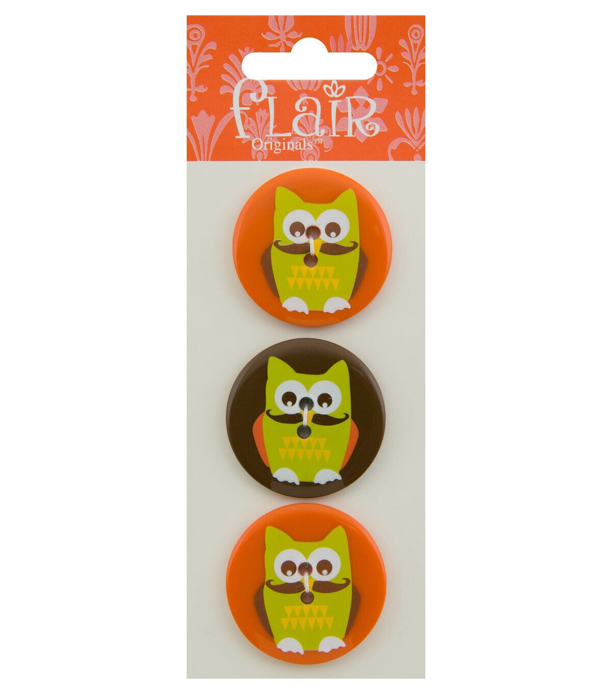 Create unique gifts for the owl lovers in your love using the Flair Originals 2 Hole Round Buttons - Owls. These sew-through buttons are printed with image of a fun owl with a mustache. You can add them to your handmade dress, top, fabric tote, wallets and more. This pack contains three buttons.