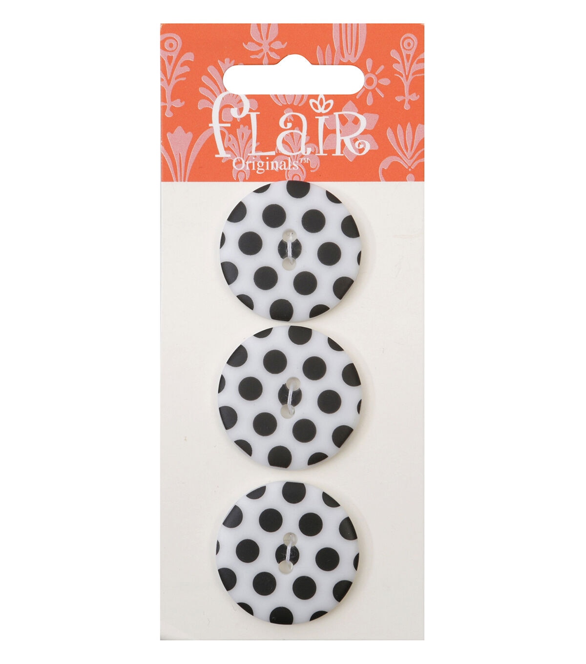 The Flair Originals Buttons-Black Polka Dots will make the perfect addition to your DIY retro-style apparel. They are printed with a polka dot pattern in a dark shade. These buttons will look lovely when stitched onto dresses, tops, skirts and more. You can also mix and match them with coordinating buttons for added charm.