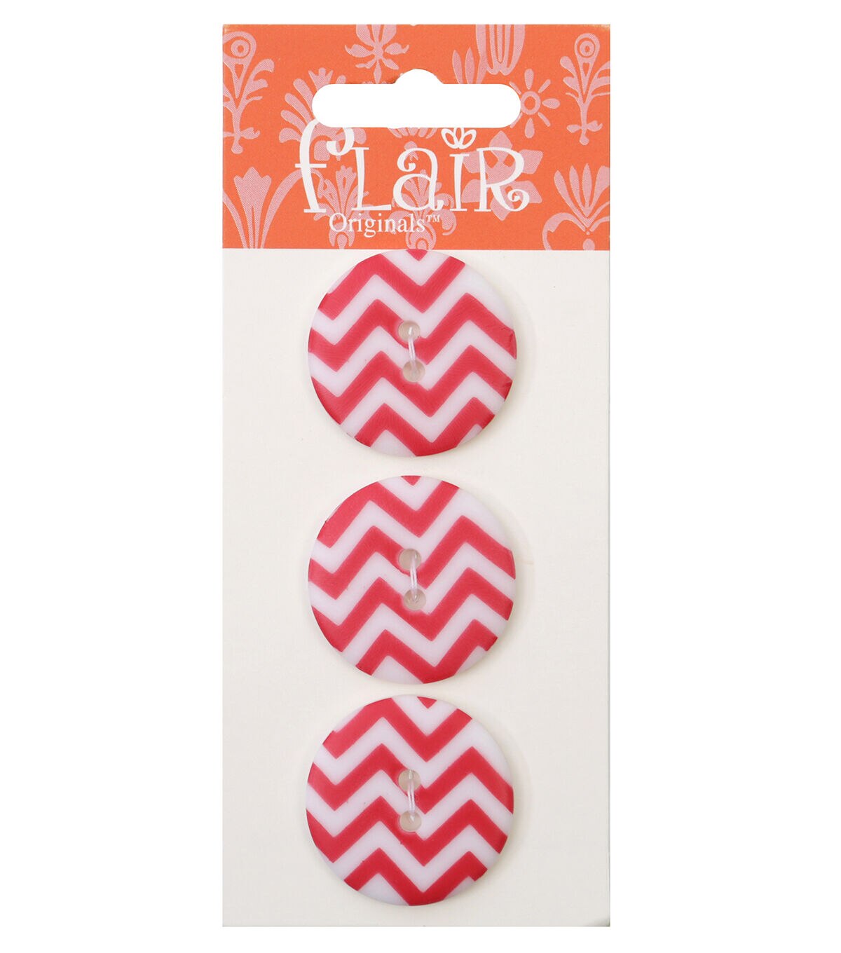 Add a lovely colorful touch to your apparel projects with the Flair Originals Buttons Red Chevron. These lovely buttons are printed with the classic chevron pattern in a bright red shade for visual charm. Add them as fasteners or use them for decorative purposes when designing dresses and tops. You can also stitch them onto fabric totes and backpacks.Brand: Flair Originals Collection: Apparel Buttons,Novelty Buttons Theme: Chevron Includes three buttons Size: 1 inch
