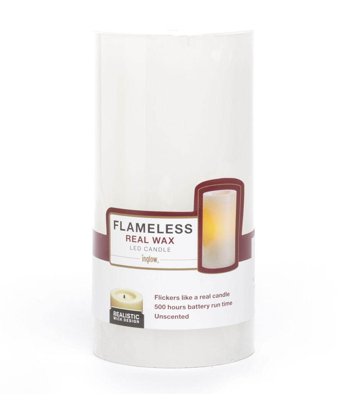 Add a touch of illumination to any space with the glow of our flameless LED pillar candle. Made of real wax with a smooth top and realistic black wick, this battery operated pillar offers a true candle experience in a safe, flame free format. A 5 hour timer lets you customize your lighting experience. White finish.