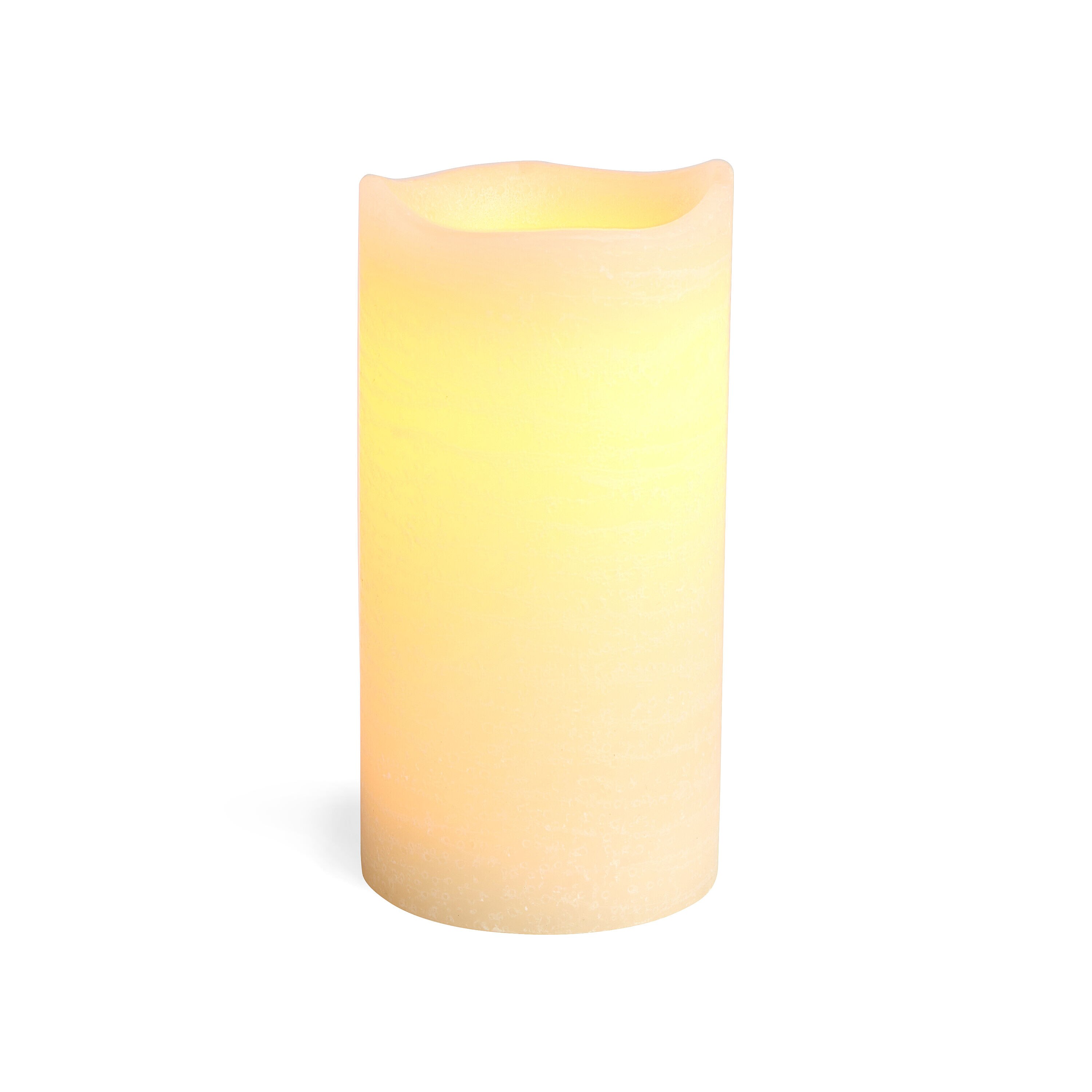 The relaxing scent of vanilla and the welcoming glow of an amber LED combine in this flameless pillar candle. A rustic design adds texture and a melted top gives a true candle experience. Features an on and off switch and a 5 hour timer that lets you customize your illumination. Runs on 2 AA batteries sold separately. Cream finish.
