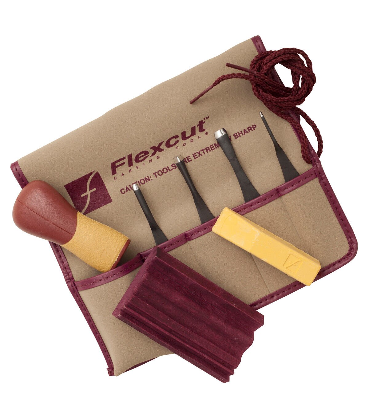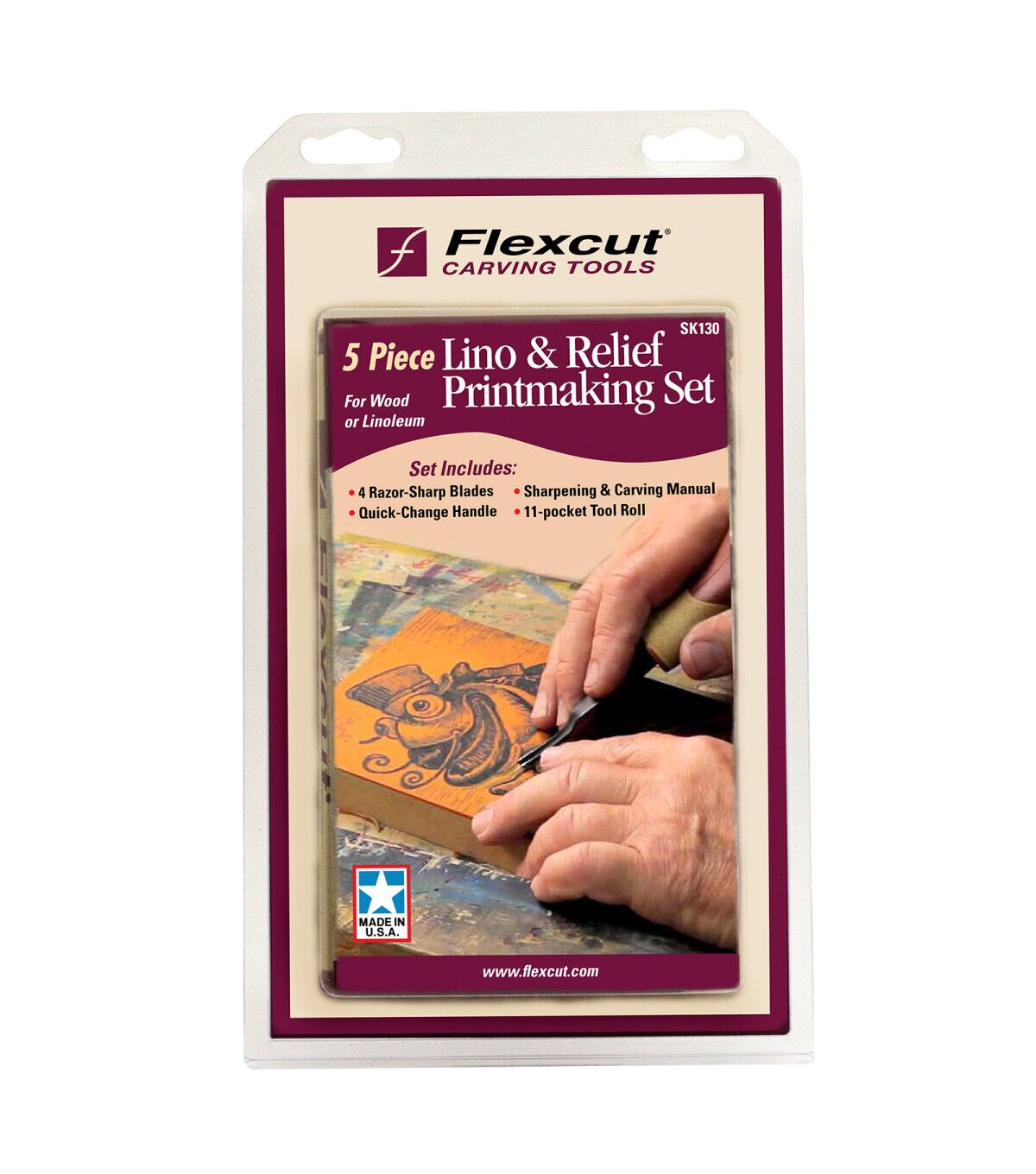 This set contains four carving blades, a quick-connect ABS handle, an handy 11-pocket tool roll, a custom strop and a polishing compound. It includes one #6 x 5/16 Sweep, #11 x 1/8" Sweep, one 1mm x 45 degree V-Tool and one 1/4" x 70 degree V-Tool. This set is ideal for relief printing, which is based on a reductive process; carve the negative space away from a flat, level surface and ink the remaining top surface (the image) with a roller or brayer in order to print the image.