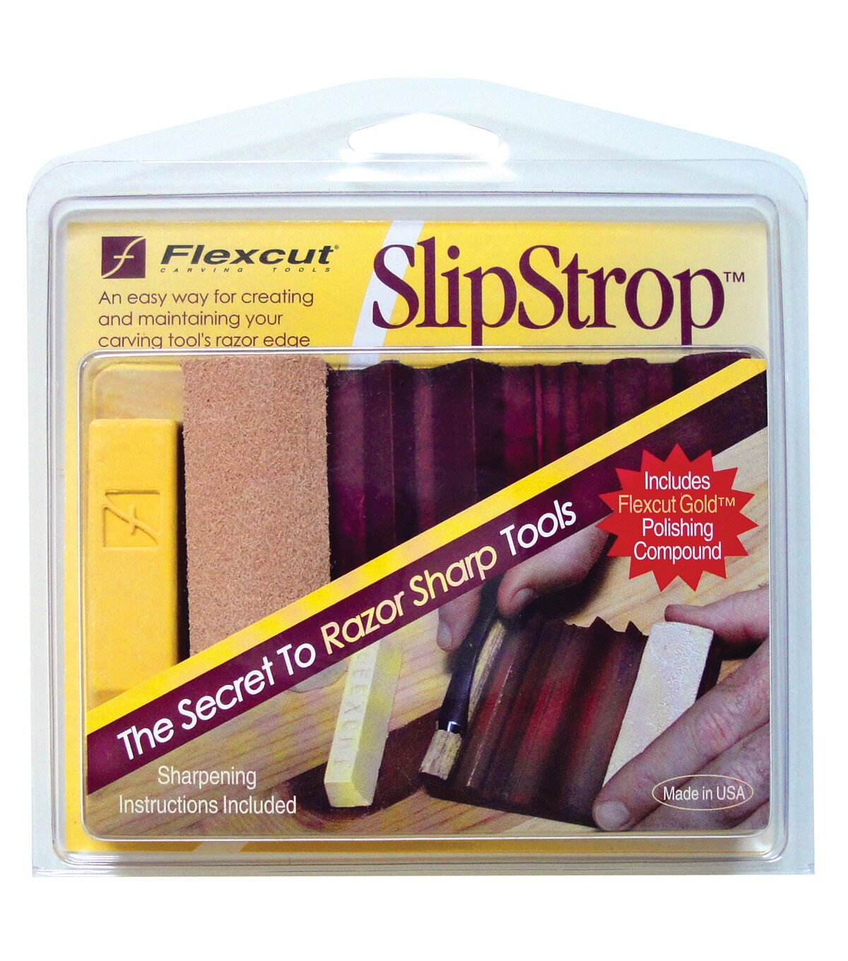 The FlexCut SlipStrop is an economical way to maintain a razor sharp edge on carving tools and knives. It has been specially molded to allow for polishing and deburring the hard-to-reach areas on the inside of V-Tools and Gouges as well as the outside edge bevels. Keep your tools in optimal condition and your carving experience smooth and consistent.