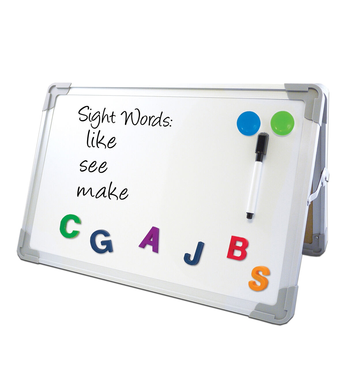 Ideal for small-group learning activities, this versatile Flipside Products Inc. Magnetic Dry-Erase Desktop Easel Set brings interactivity to a child's fingertips. This kit features two magnetic dry erase surfaces, one dry erase pen with magnetic eraser cap and two colorful disk magnets. Its lightweight aluminum frame with rounded plastic corners for style and safety folds flat for easy storage. Opens to 10.5-inch deep with locking hinges for stability and safety.