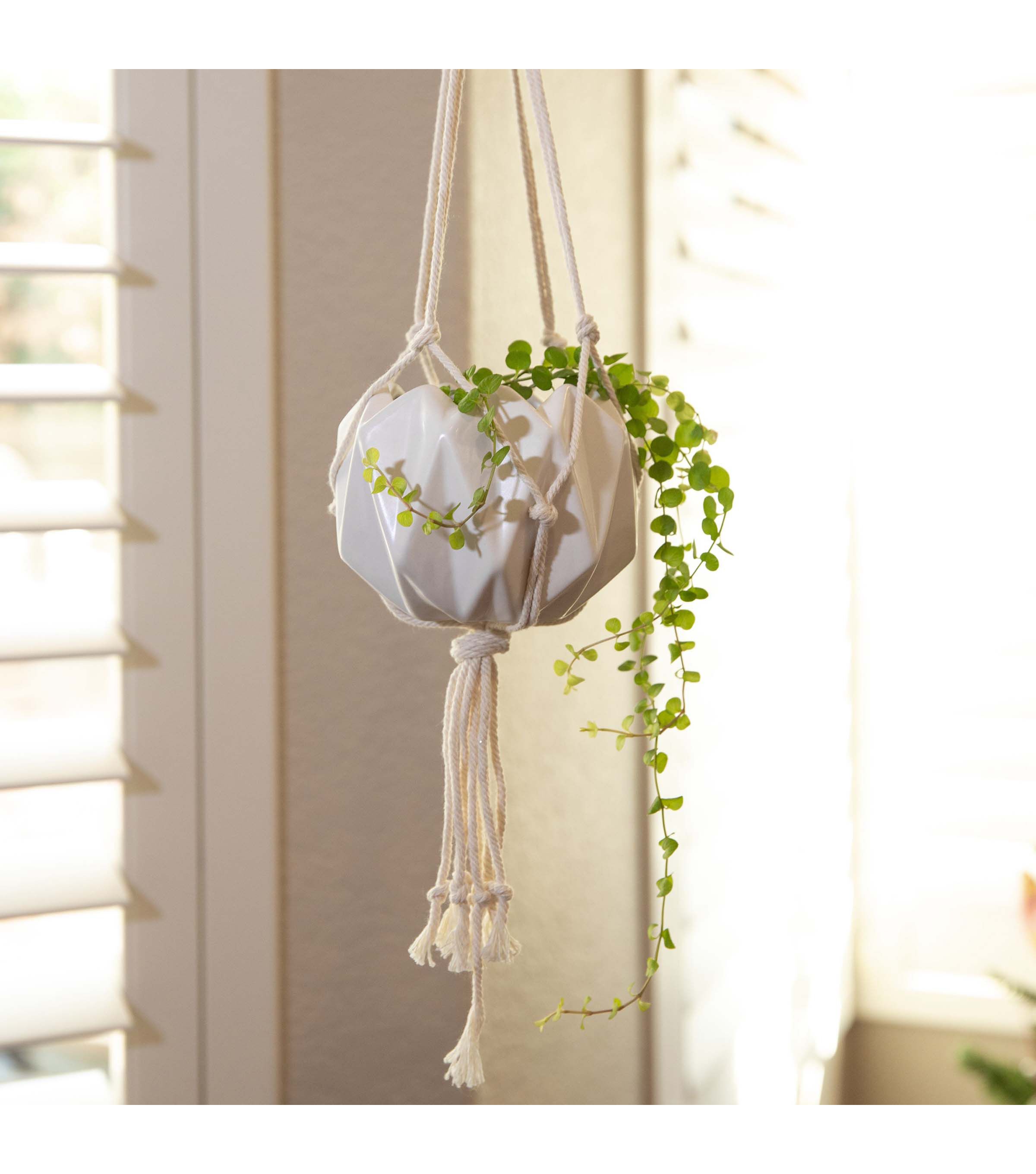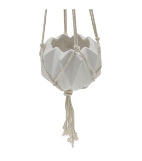 Hang with me! Hang this Geometric Ceramic Planter anywhere in your home to create an indoor floating oasis. Handcrafted by Artisans, our macramé hanging planter will help elevate your plant game in a modern style. Made of ceramic with geometric patterns and painted matte white, this 5"x5"x4" hanging planter will add a bit of chic nature to your living space. Buy a few at a time, so you can start your own floating garden indoors! Handcrafted by Artisans Measurement: 5”x5”x4” Color: Matte White Material: Ceramic, Rope **No Drainage Hole. Indoor Use Only!**