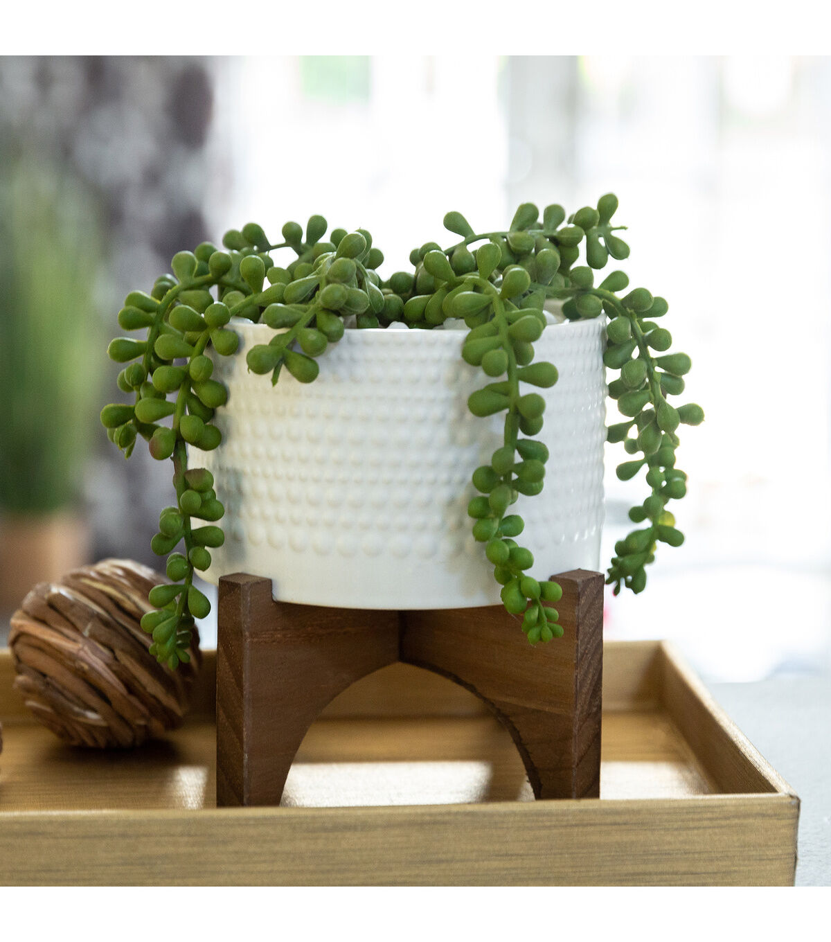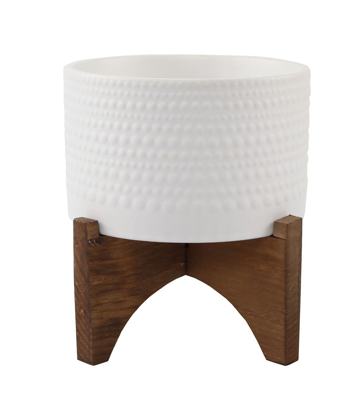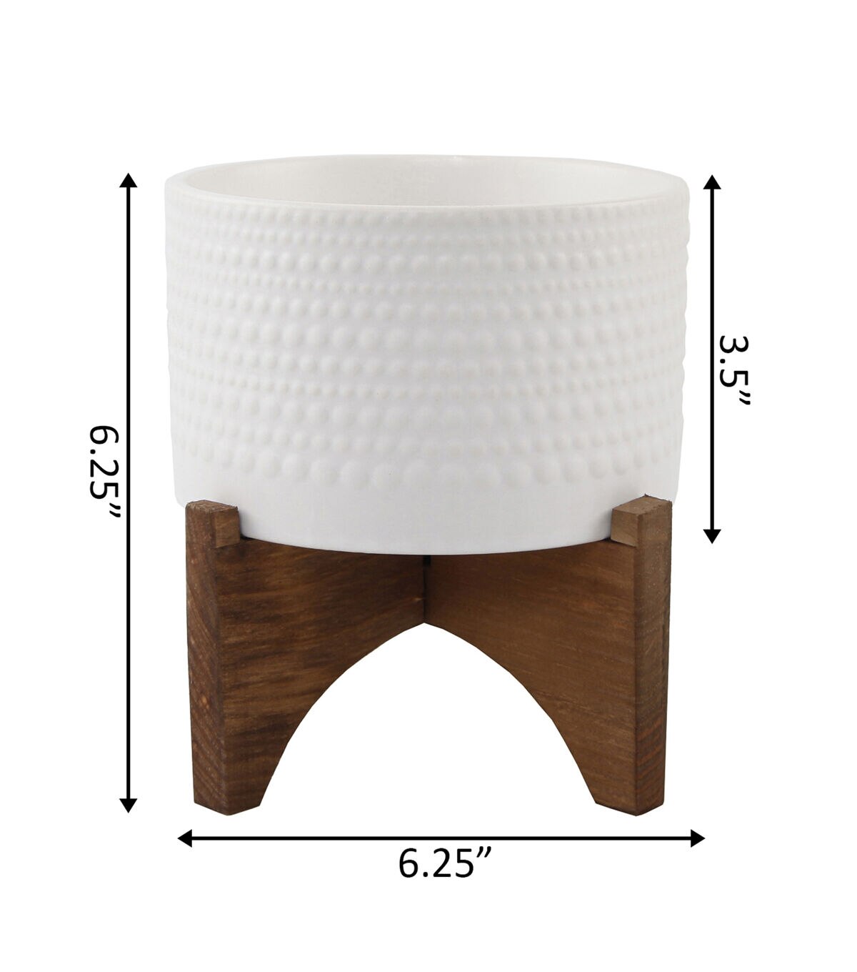 Stand by me! Place this 5” Hobnail Ceramic Planter on a Wood Stand anywhere in your home to create an indoor oasis. Handcrafted by Artisans, our 6.25”x6.25”x6.25” ceramic planter on wood stand will help upgrade your plant game in style. Made of ceramic with a Hobnail pattern and painted white with a matte finish, this tabletop planter will add a bit of chic nature to your living space.The perfect planter for planting succulents, terrariums, and indoor house plants. Buy a few at a time, so you can start your own little garden indoors! Handcrafted by Artisans Measurement: 6.25”x6.25”x6.25” Color: Matte White Material: Ceramic, Wood **No Drainage Hole. Indoor Use Only!*