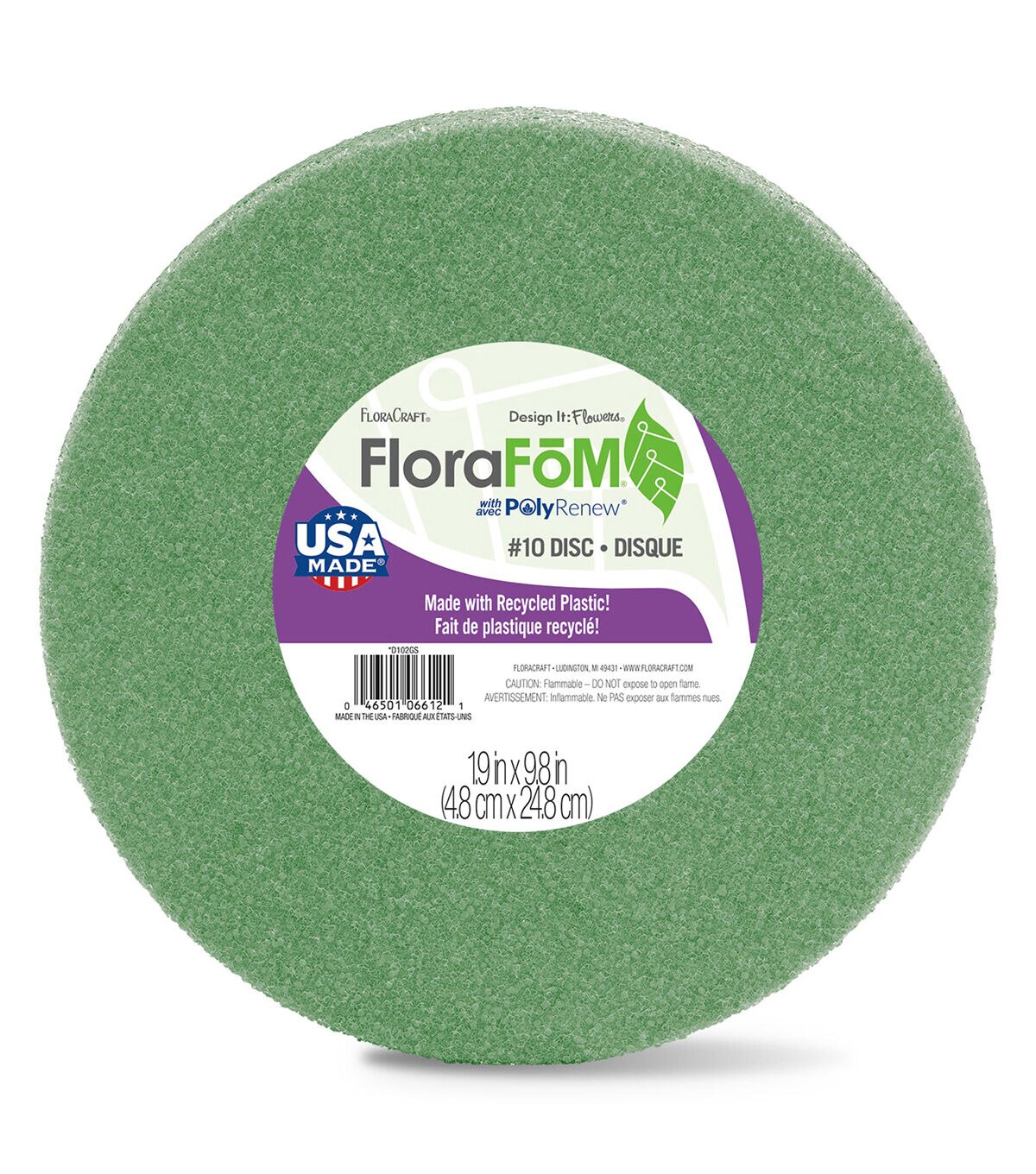 Start your floral displays and event decorations off with the right base by using FloraCraft FloraFōM - now made with recycled plastic! Its crunchy cell structure is great for holding artificial flower stems, heavy-stemmed naturals (like branches and twigs) and floral picks in place. It can also be cut, shaped, painted or textured to create any customized home or event décor. Plus, FloraCraft FloraFōM is suitable for both indoor and outdoor use. This package contains one 1.9" x 9.8" green foam disc. Made by a socially responsible, American company.