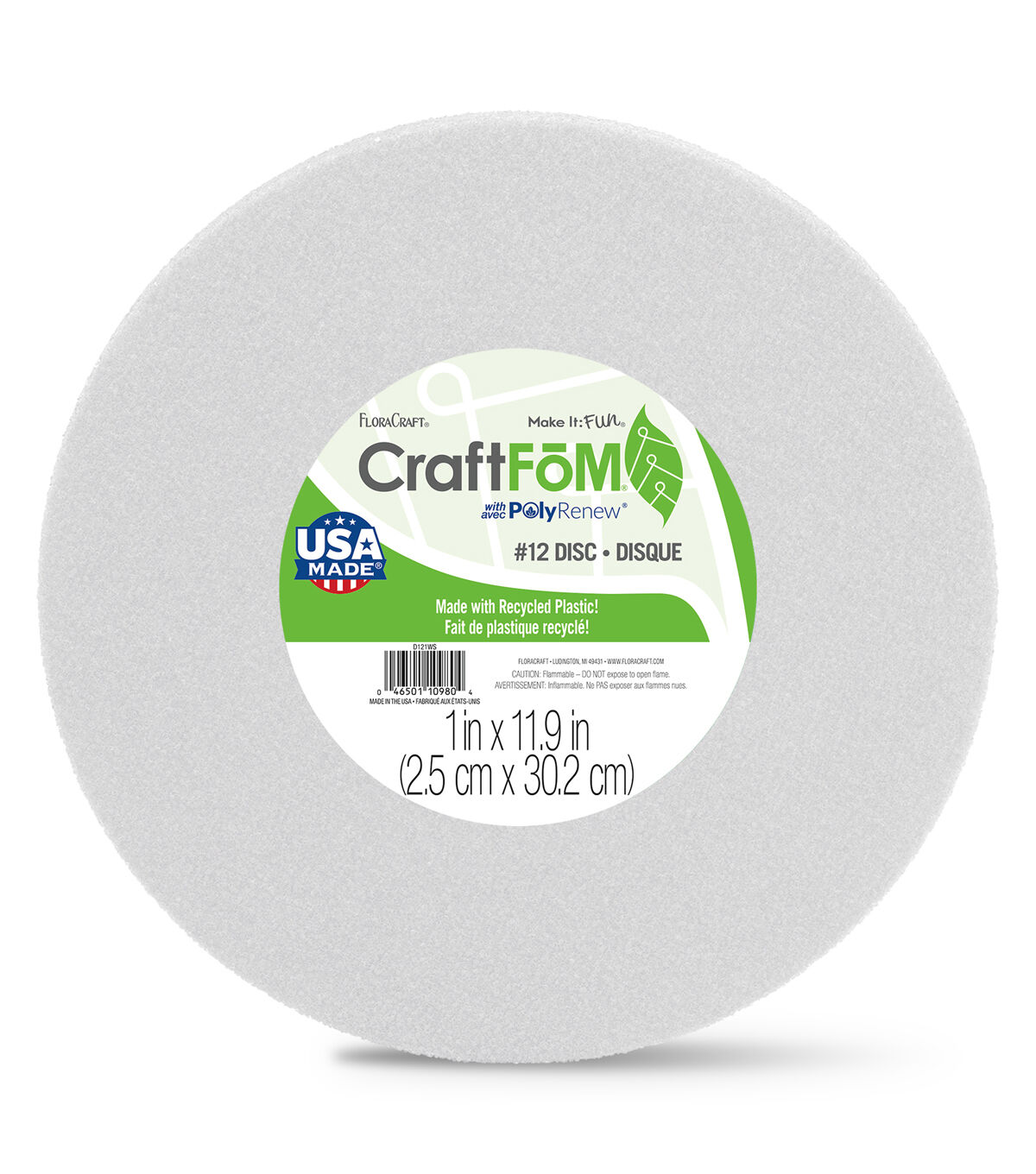 Start your school and craft projects with the right base by using FloraCraft CraftFōM - now made with recycled plastic! Its lightweight structure is great for classroom projects, party and event displays and seasonal décor. FloraCraft CraftFōM can be painted or coated with a broad range of products to create virtually any color or texture. Plus, it's suitable for both indoor and outdoor use. This package contains one 1" x 11.9" white foam disc. Made by a socially responsible, American company.