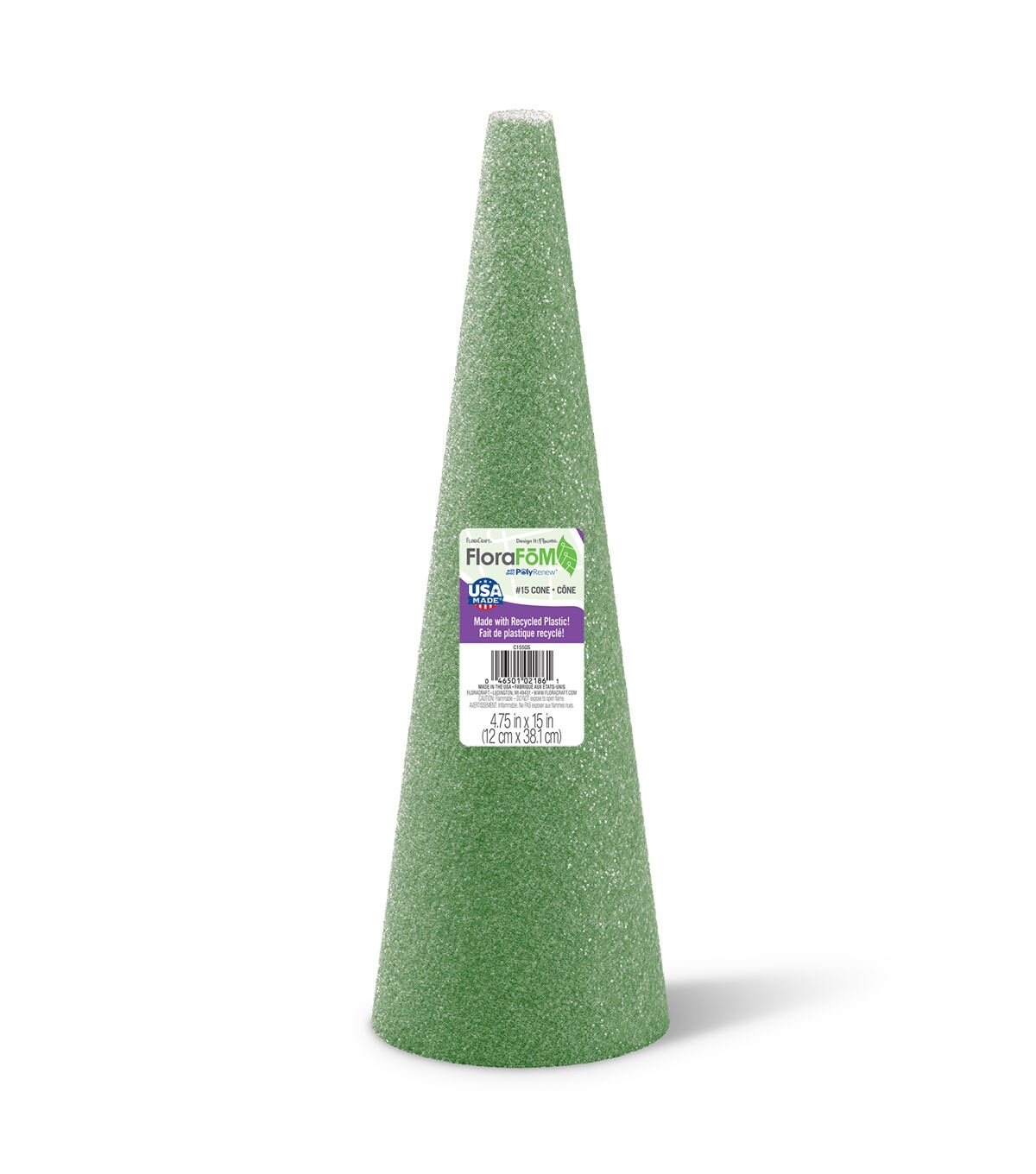 Start your floral displays and event decorations off with the right base by using FloraCraft FloraFōM - now made with recycled plastic! Its crunchy cell structure is great for holding artificial flower stems, heavy-stemmed naturals (like branches and twigs) and floral picks in place. It can also be cut, shaped, painted or textured to create any customized home or event décor. Plus, FloraCraft FloraFōM is suitable for both indoor and outdoor use. This package contains one 4.75” x 15” green foam cone. Made by a socially responsible, American company.