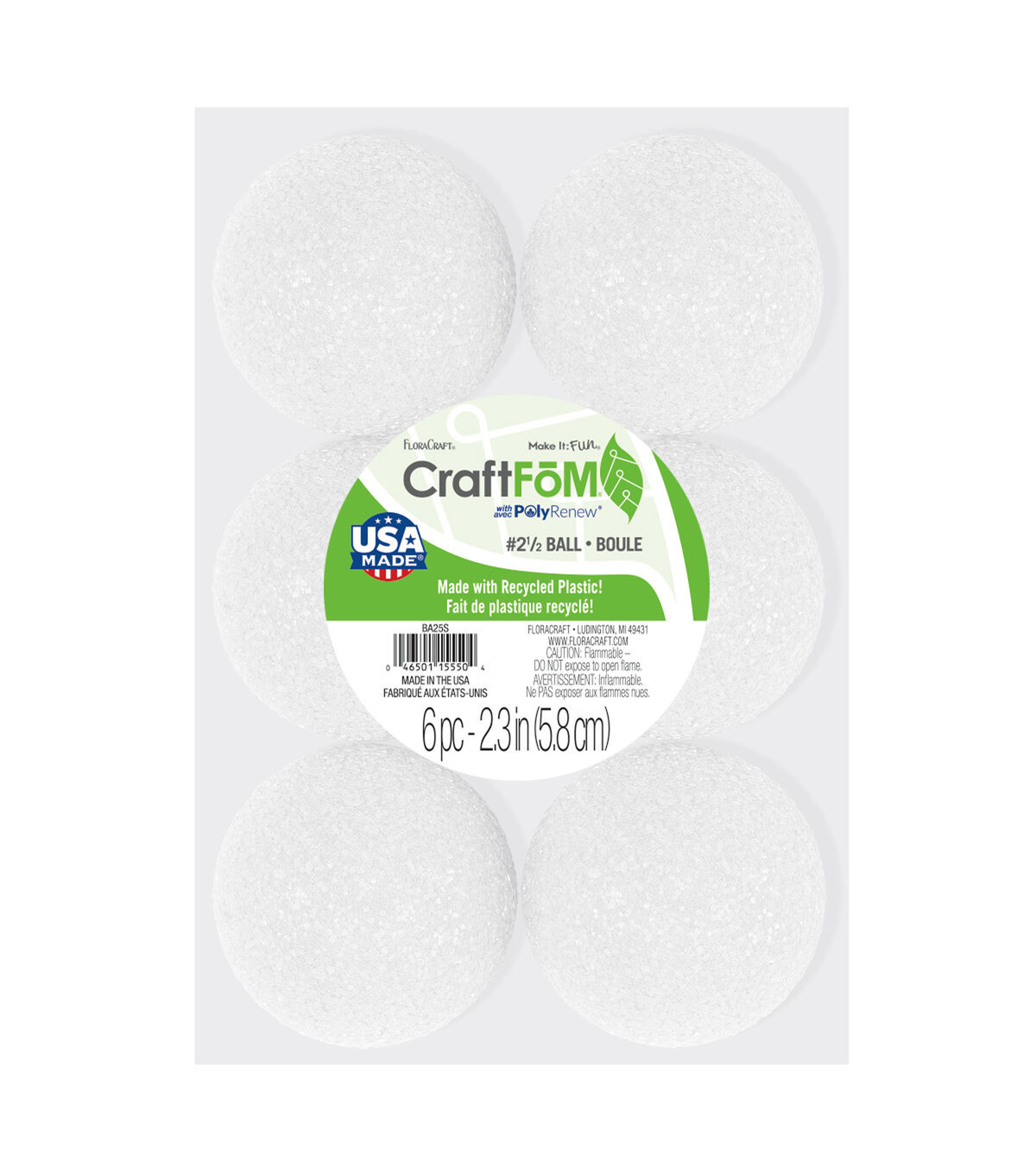 Start your school and craft projects with the right base by using FloraCraft CraftFōM - now made with recycled plastic! Its lightweight structure is great for classroom projects, party and event displays and seasonal décor. FloraCraft CraftFōM can be painted or coated with a broad range of products to create virtually any color or texture. Plus, it's suitable for both indoor and outdoor use. This package contains six 2.3" white foam balls. Made by a socially responsible, American company.