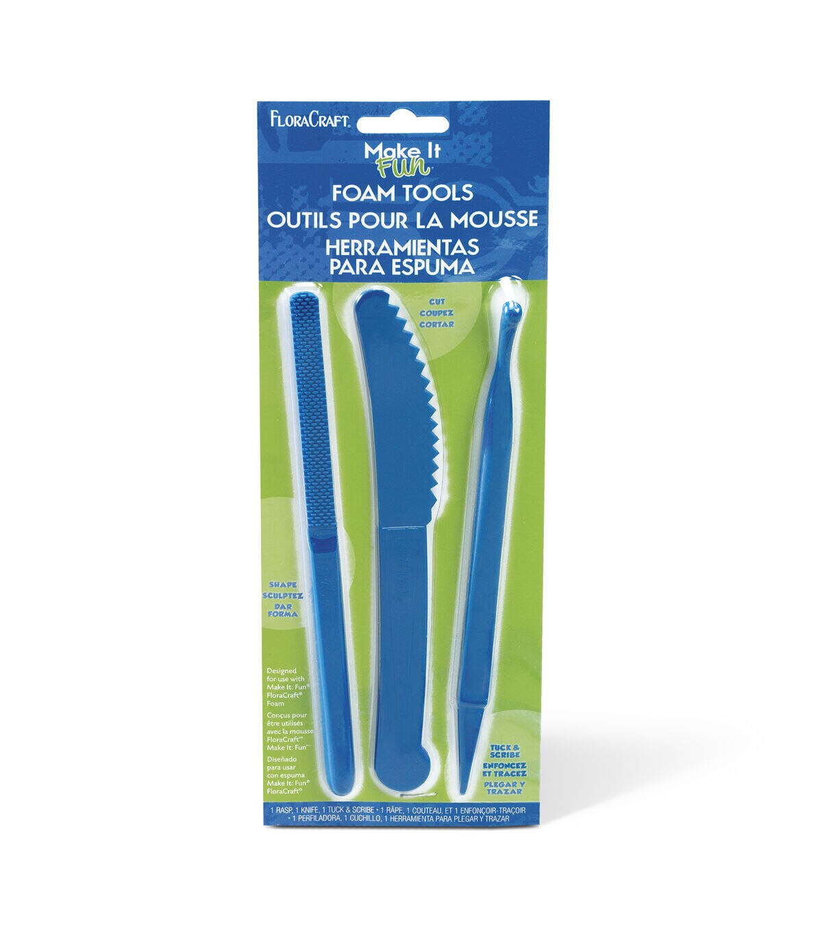 This three-piece tool set is designed to assist beginner and seasoned crafters in creating customized FloraCraft Foam projects. The set contains a plastic knife, rasp and tuck/scribe tool. The knife features serrated teeth to easily cut through expanded polystyrene (XPS) foam. The rasp tool is used to sand cut edges, smooth rounded corners and ‘erase’ template marks on foam. The tuck end of the tuck and scribe tool is used to professionally “tuck” fabric, ribbon, felt or other materials into foam. The scribe end of the tuck and scribe tool is used to deboss and inscribe a design or wording into foam. Its wide range of uses are great for creating event displays, models and custom foam shapes. Perfect for adding personalized décor to special events including weddings, birthdays, engagement parties, baby and bridal showers, and graduations as well as holidays like Christmas and Halloween! This package includes one 3-piece Foam Tools set.