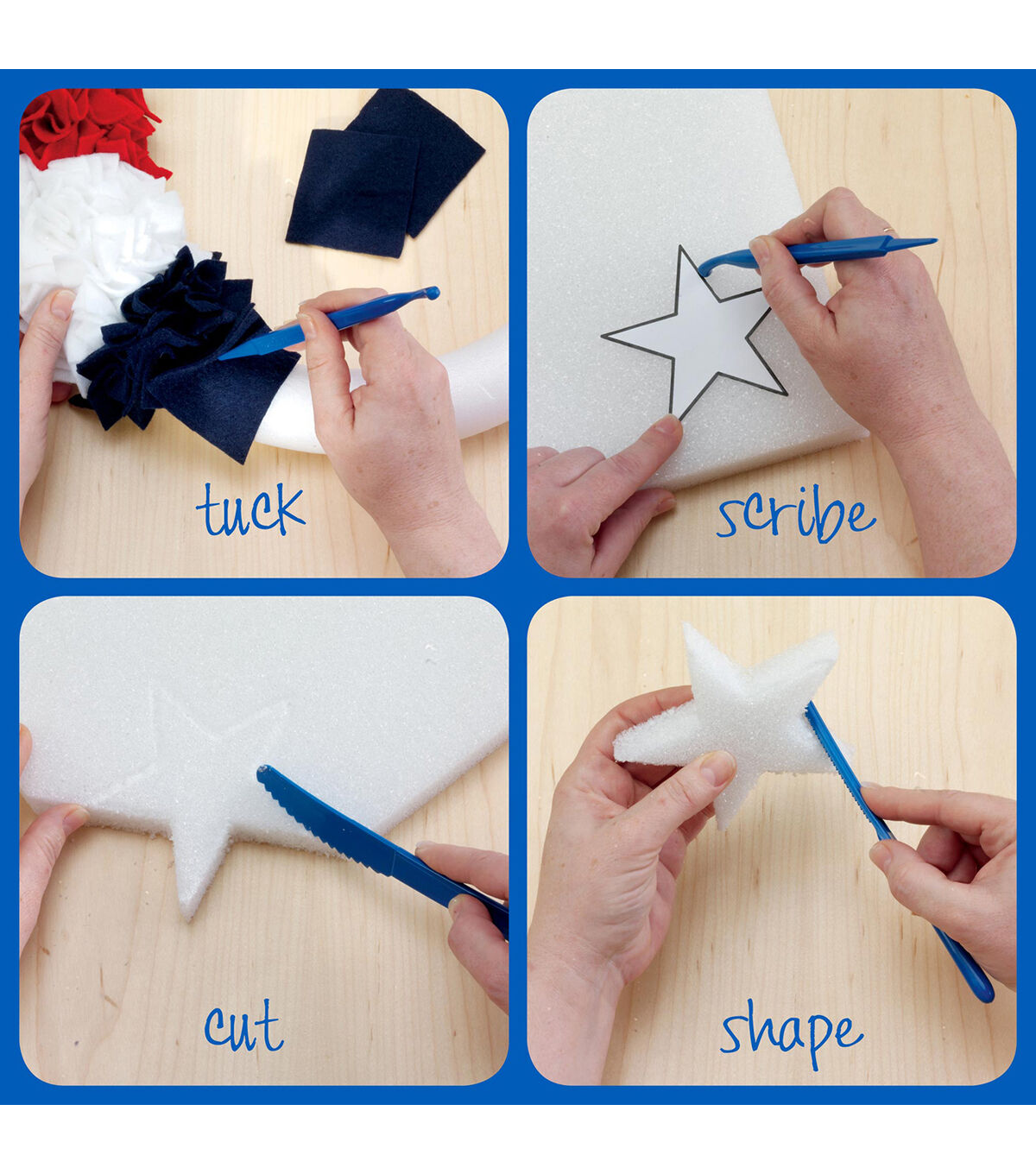 - The tuck end of the tuck and scribe tool is used to professionally “tuck” fabric, ribbon, felt or other materials into foam.