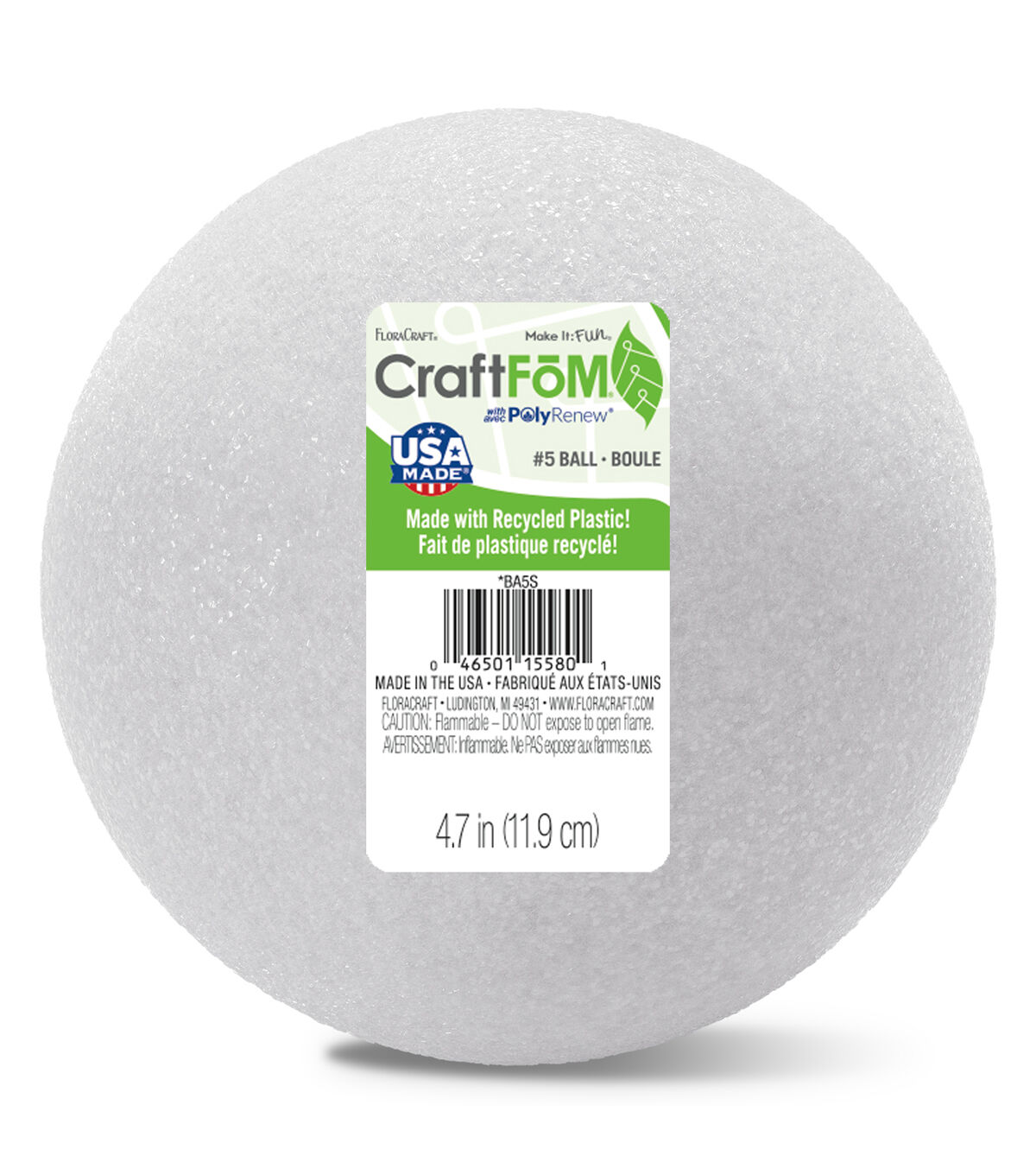 Start your school and craft projects with the right base by using FloraCraft CraftFōM - now made with recycled plastic! Its lightweight structure is great for classroom projects, party and event displays and seasonal décor. FloraCraft CraftFōM can be painted or coated with a broad range of products to create virtually any color or texture. Plus, it's suitable for both indoor and outdoor use. This package contains one 4.7" white foam ball. Made by a socially responsible, American company.