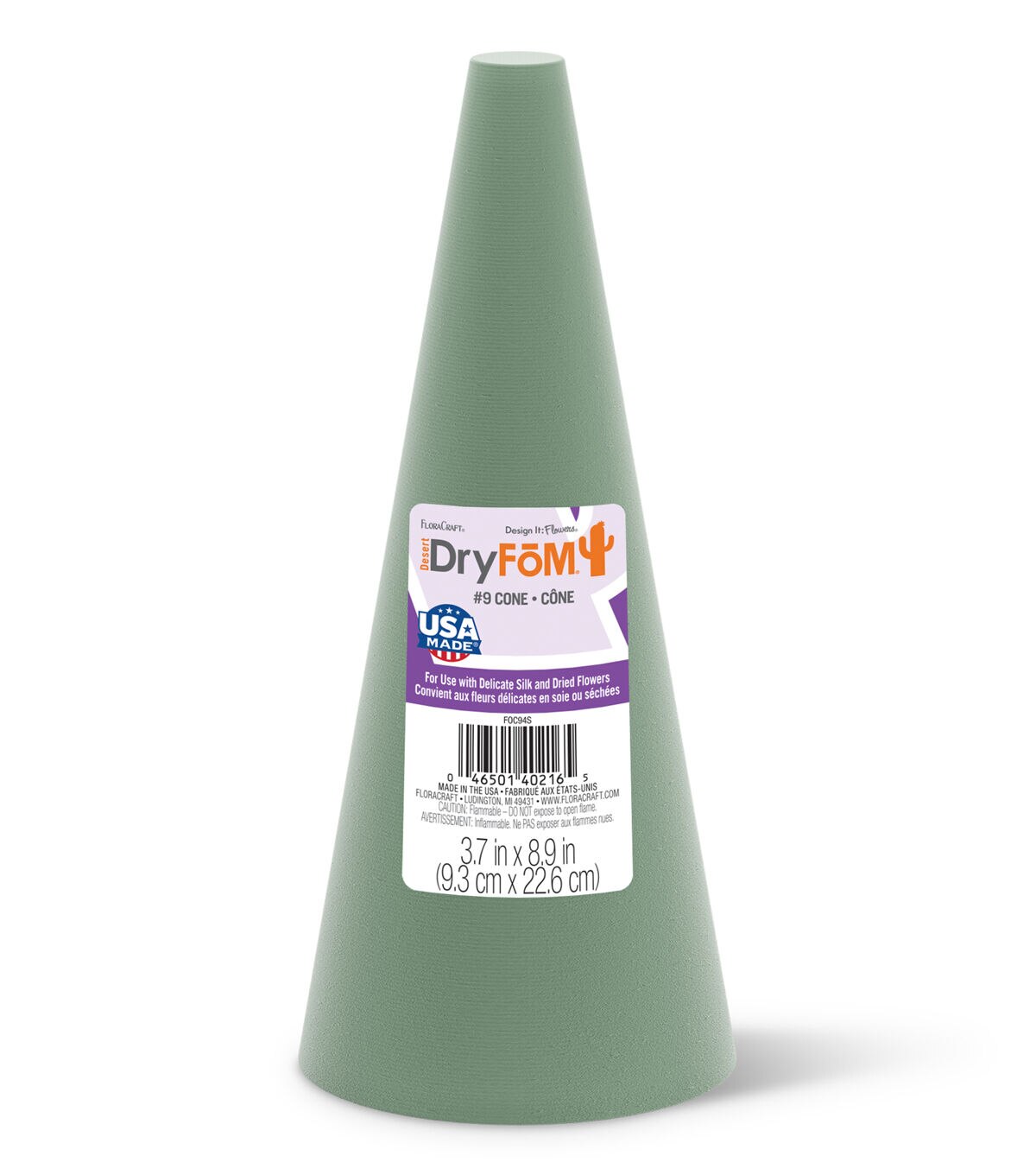 Create your next dried or silk floral arrangement with FloraCraft Desert DryFoM. Its soft cell structure is great for arranging fragile dried stems, delicate artificial flowers and wispy permanent botanicals. FloraCraft’s Desert DryFōM cuts easily to fit any size container and blends in with floral stems and moss for a natural look. Great for beginner and professional florists alike. This package contains one 3.7" x 8.9" dry foam cone. Made by a socially responsible, American company.