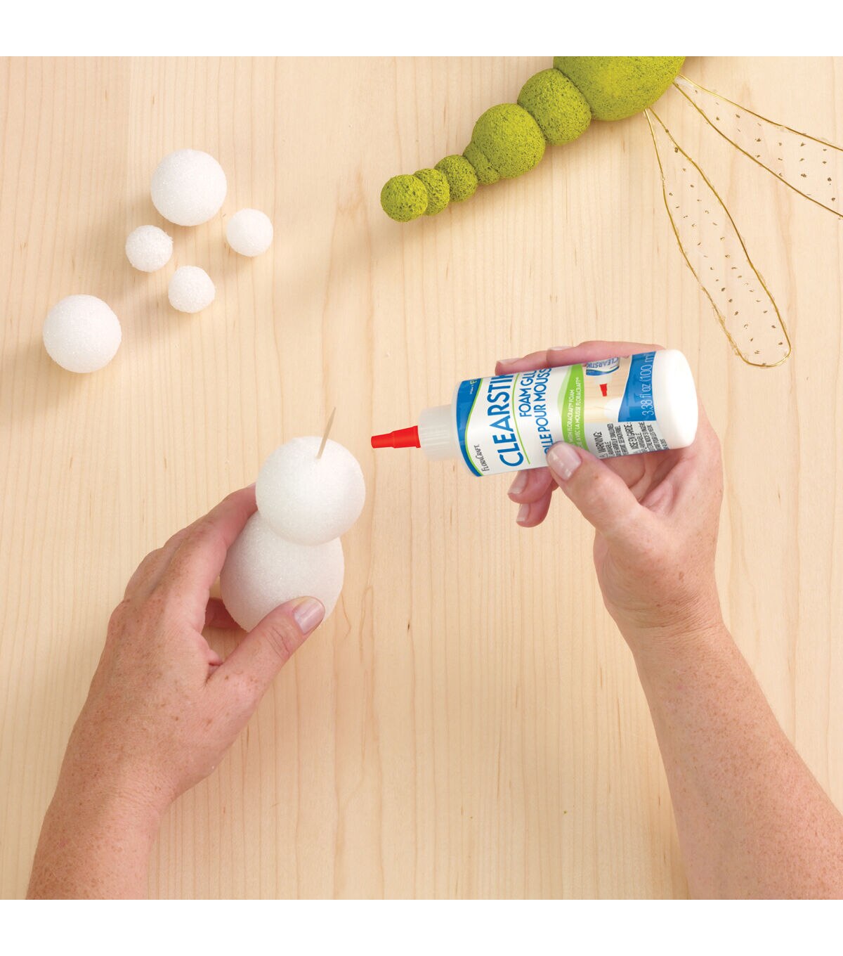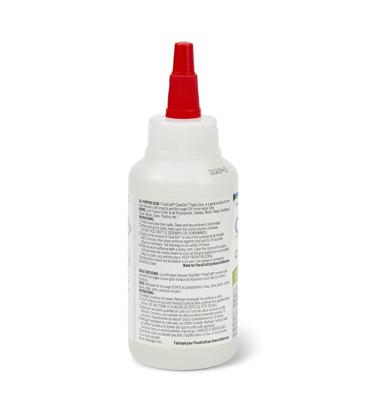 ClearStik Foam Glue is a specially formulated adhesive designed to be used with FloraCraft Foam. This all-purpose glue is a great solution for the most delicate craft projects and the tough DIY jobs. It’s unique formula bonds extruded polystyrene (XPS), expanded polystyrene (EPS) and ethylene-vinyl acetate (EVA) craft foams with glitter, wiggle eyes, felt, fabric, paper, vellum, plastic, glass, metal, wood, silk flowers and so much more. The clear-drying glue holds its elasticity when cured which prevents delicate foam cells from breaking and creates a secure bond. Full bonding occurs within 24 hours. Easy-to-use, twist cap allows you to unseal and reseal without any mess. This package contains one 3.38 fluid ounce bottle of ClearStik Foam Glue.