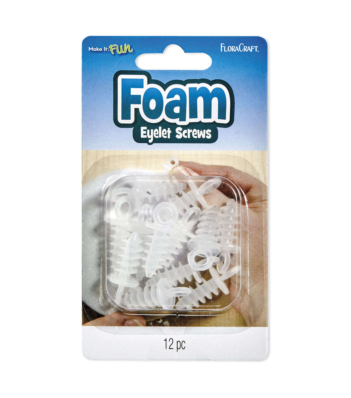 FloraCraft eyelet screws are specially designed to be used with FloraCraft XPS foam to provide an easy hanging method for your craft and DIY projects. The durable plastic threads grip the foam cell structure for secure hold and the eyelet opening is wide enough for thick yarn, ribbon and rope. Perfect for hanging kissing balls, solar system models and more - the possibilities are endless. The clear plastic blends in with any project design and virtually disappears. This package includes twelve 1.1" plastic eyelet screws.