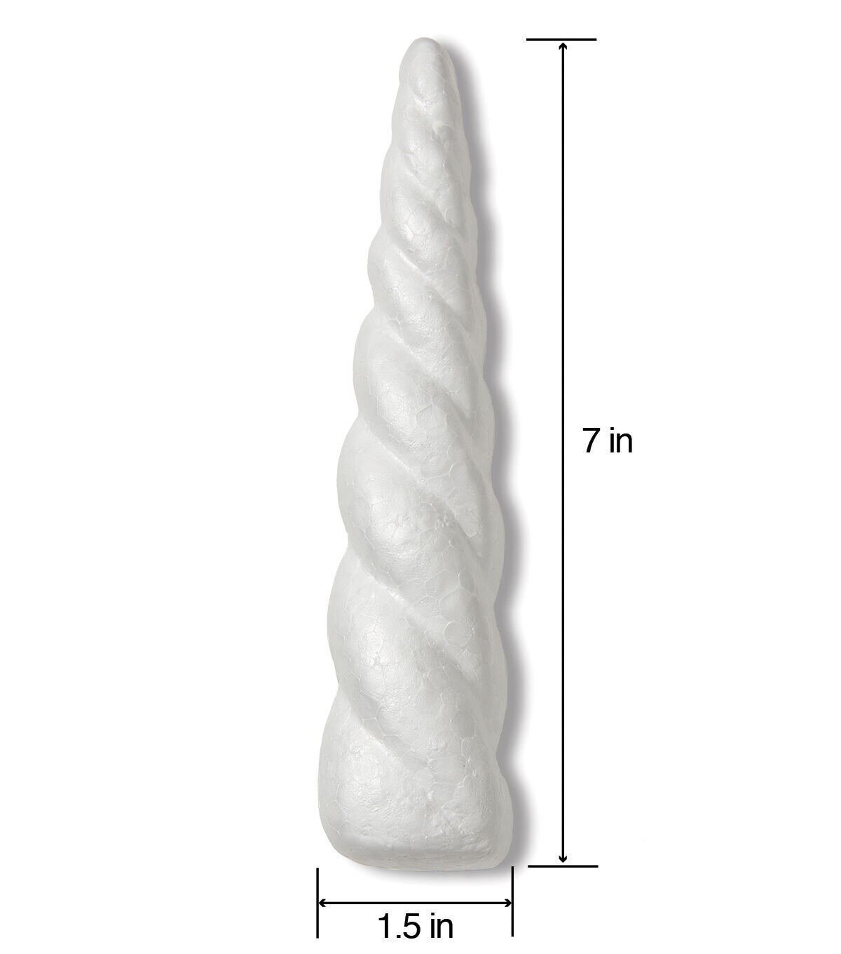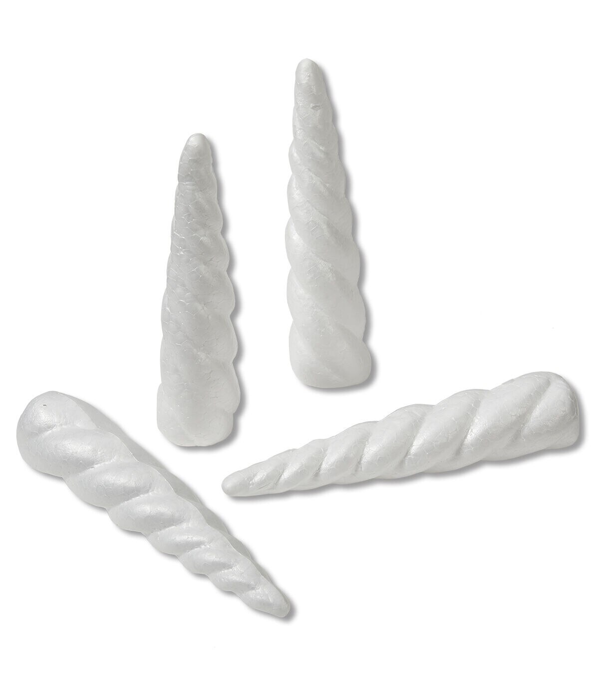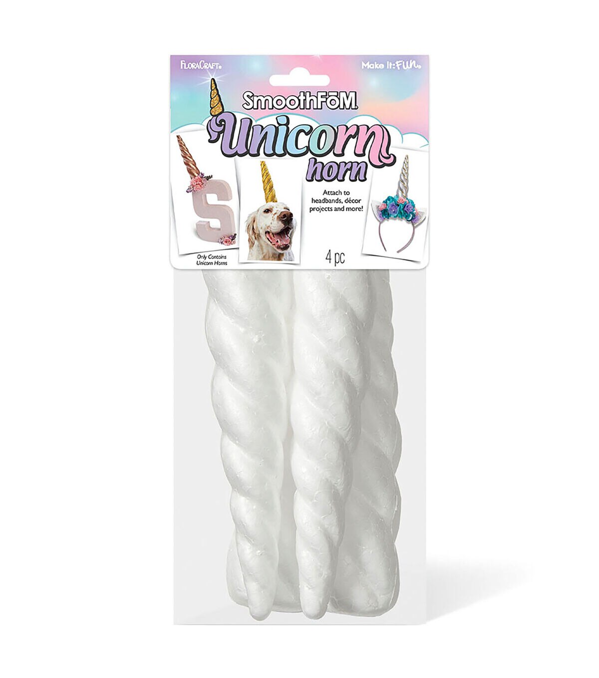 The SmoothFoM unicorn horn shape is made from molded, expanded polystyrene (EPS). The smooth, durable surface is ideal for painting or coating with a broad range of products to create any custom color or texture. The 7” spiraled horn shape is perfect for creating cosplay décor, unicorn headbands, magical cake toppers or party centerpieces! Easily customize the foam horn to use at special events like themed birthdays, baby showers and kid’s craft parties. Plus, it can also be used for narwhal crafts! This package includes four 1.5” x 7” white EPS foam unicorn horns.
