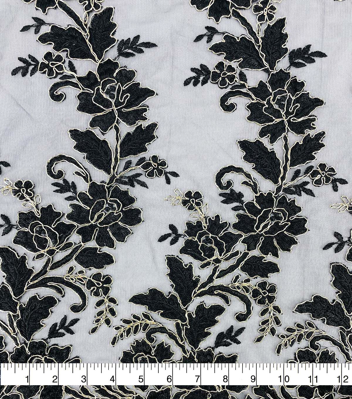 Floral Gold Cording Black Mesh Fabric