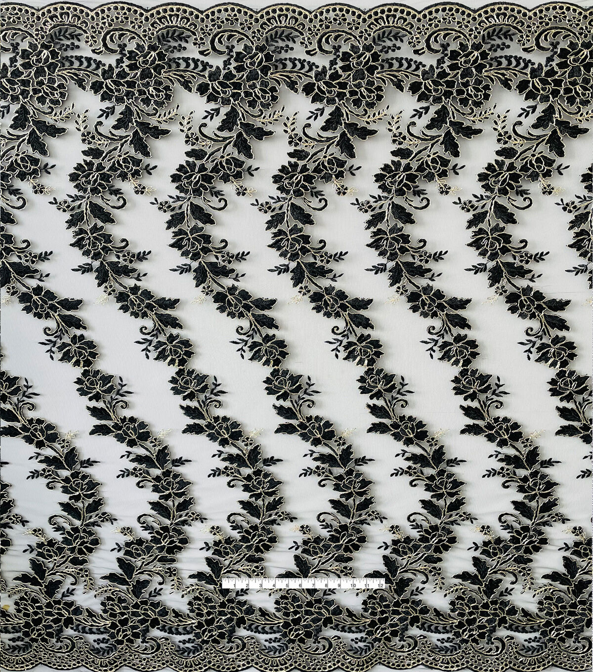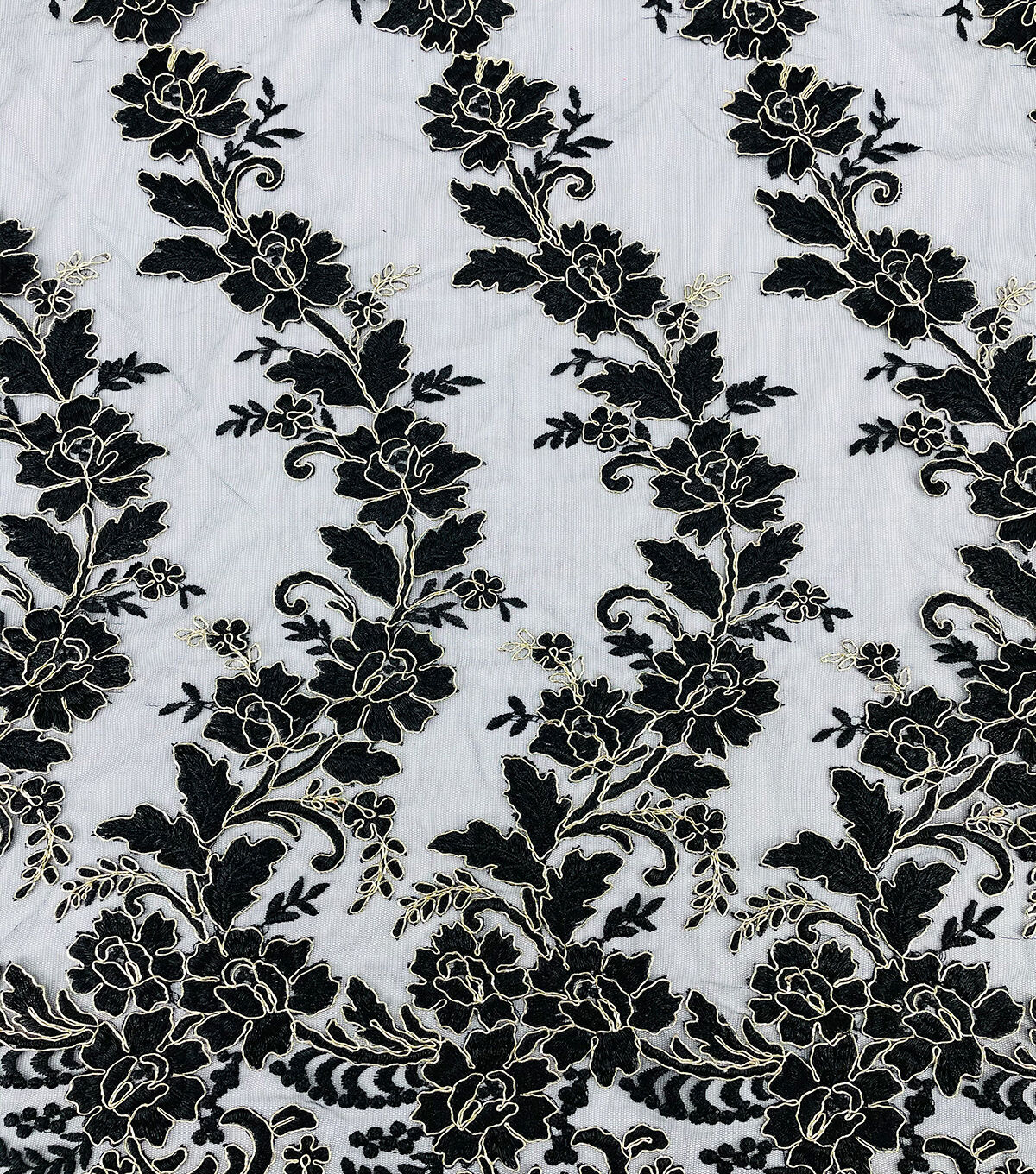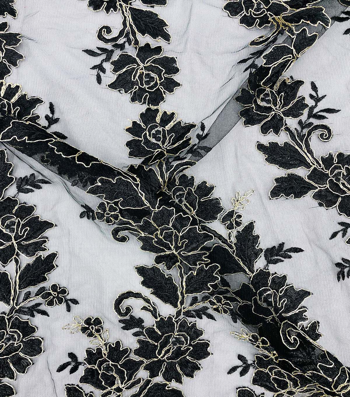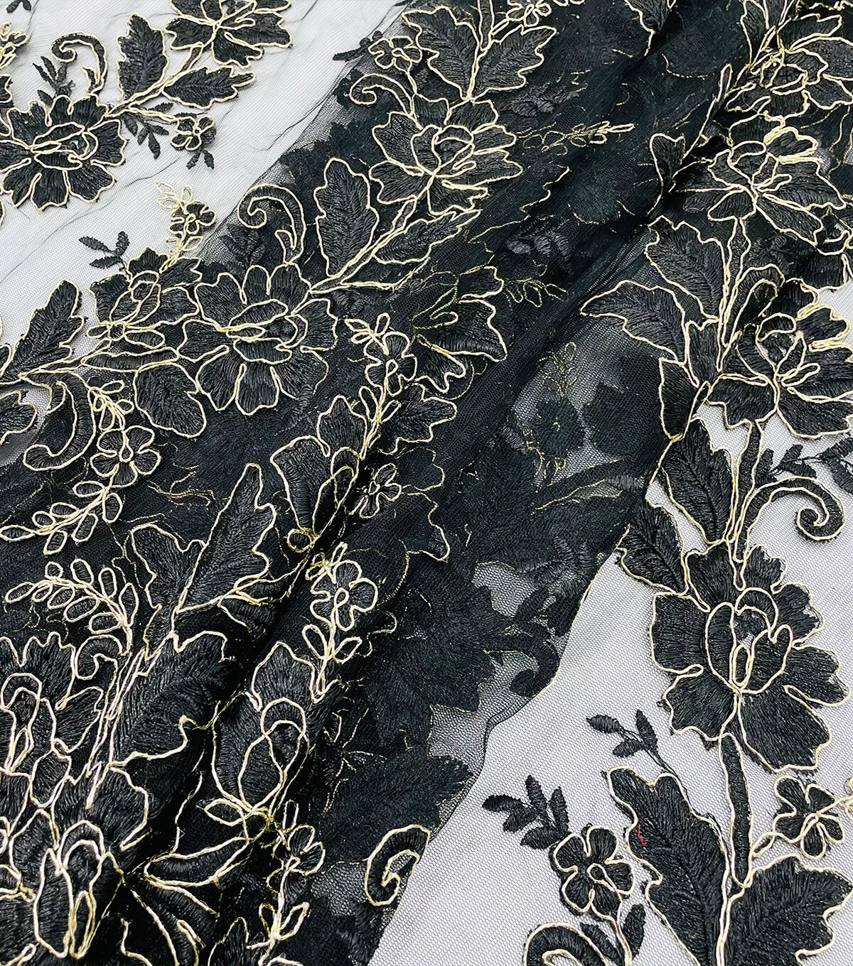 • Floral Gold Cording Black Mesh Fabric
