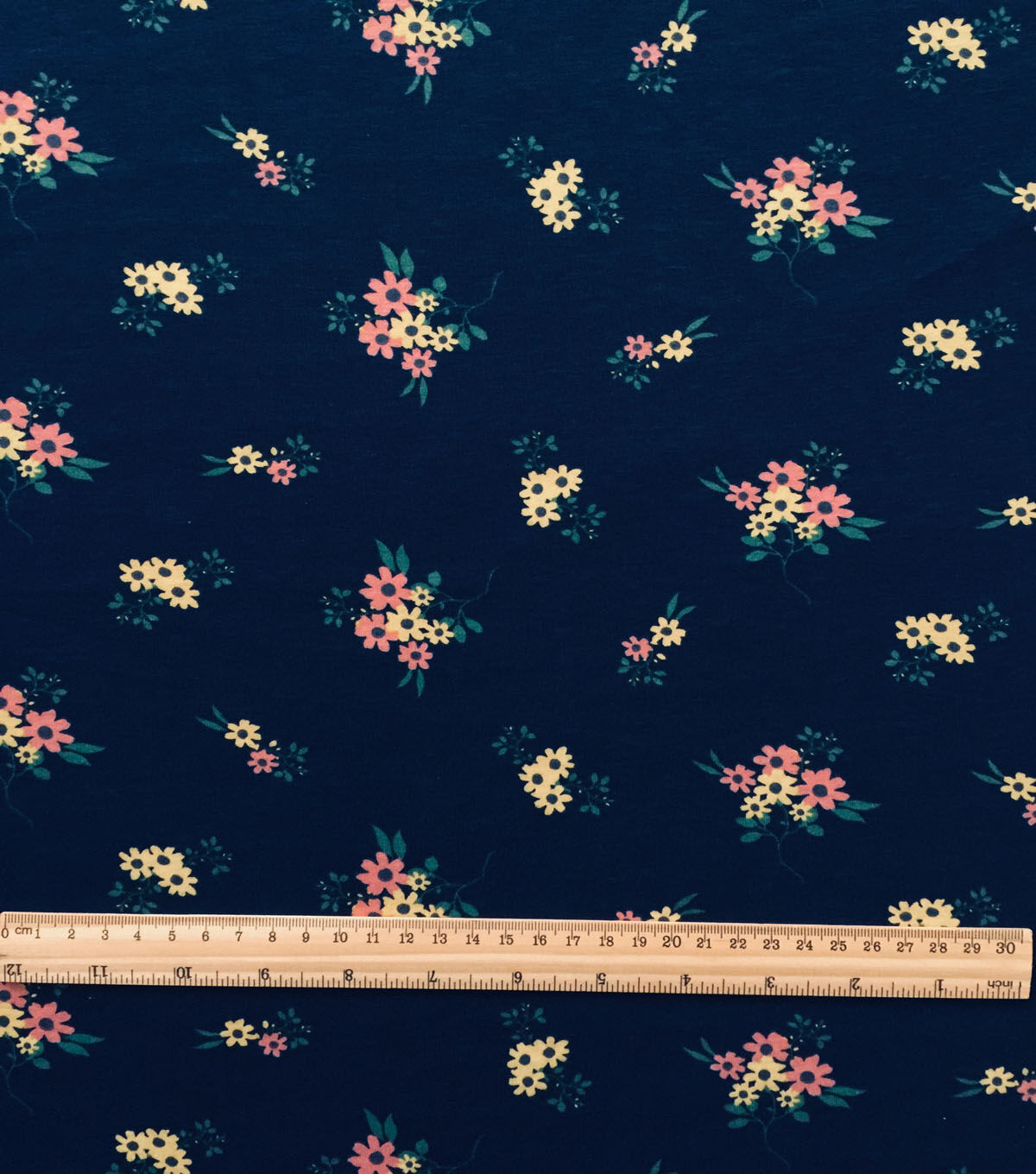 Our Floral on Blue Jersey Knit Fabric is easy to care for, simply machine wash gentle cold, cool iron, and line dry. Non-chlorine bleach can also be used to keep your fabric looking fresh and new. Imported for your convenience, this fabric is perfect for any sewing project you have in mind.