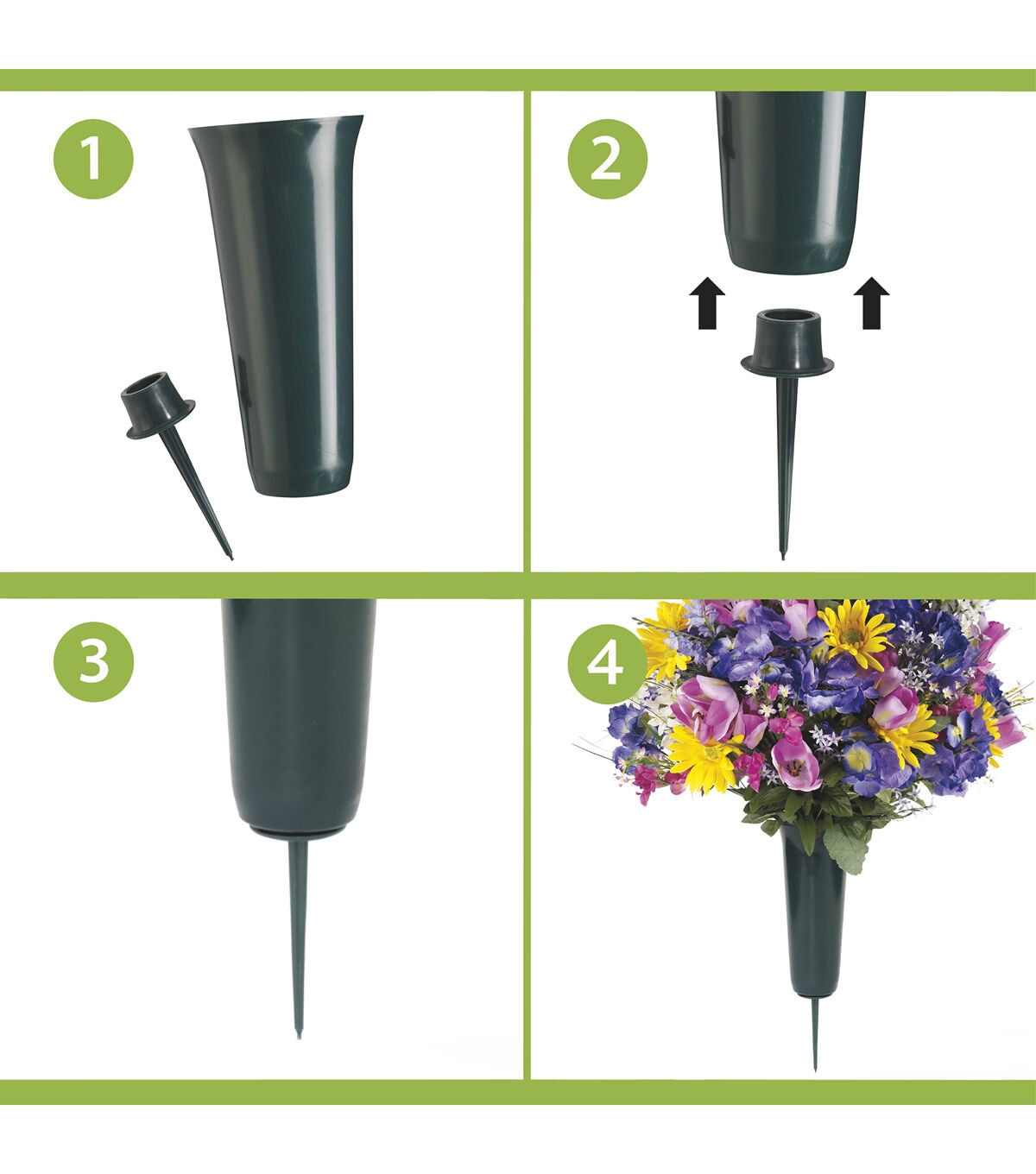 Create beautiful memorial arrangements using the Bloom Room Floral Cemetery Vase with Foam Insert. This memorial vase is pre-filled with a FloraCraft FloraFoM insert, which is now made with recycled plastic. FloraFoM is great for holding artificial flower stems, heavy-stemmed naturals and floral picks in place. The durable plastic vase comes with a 5-inch spike that holds the arrangement firmly in the ground or on a table. It flaunts a deep green color that will compliment any arrangement.