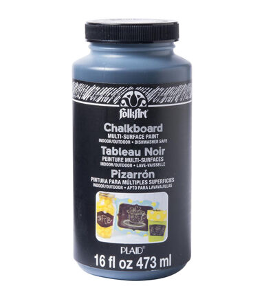 Transform your DIY projects into a fun chalkboard writing surface with the FolkArt Chalkboard Multi-Surface Paint-Black. It is water-based and non-toxic. Simply brush on, let dry and condition with chalk. Use this chalkboard paint to decorate furniture, party favors, glass, metal or gifts for a unique look.