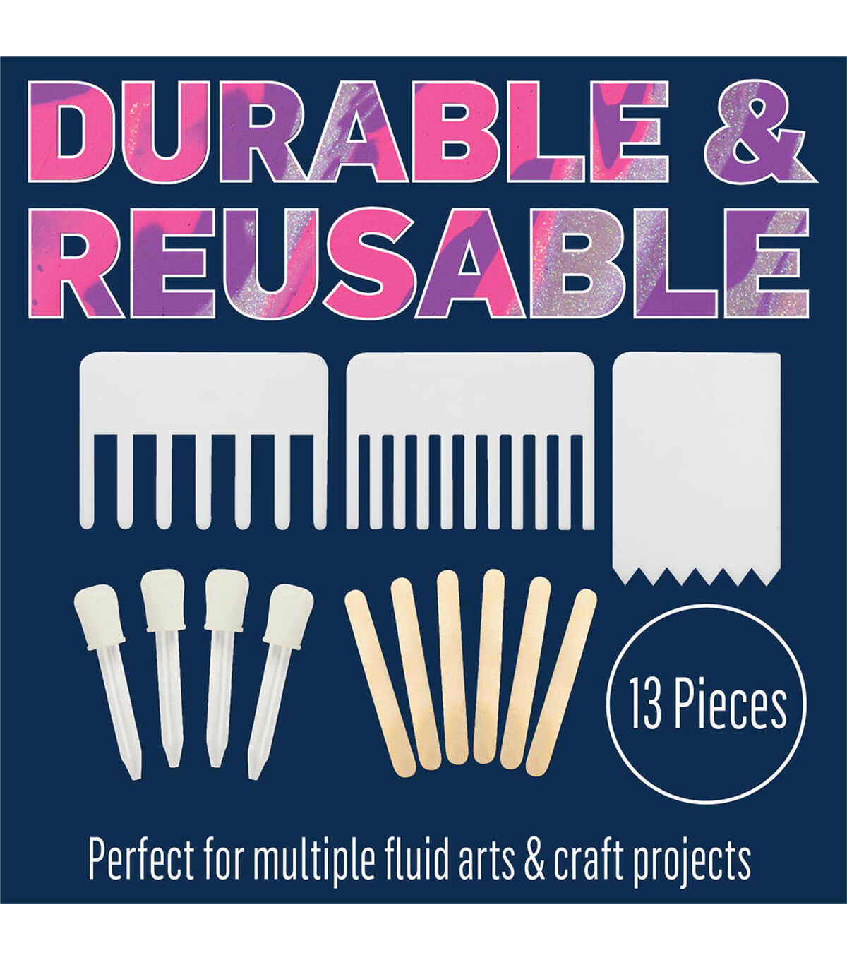 Acrylic paint pouring has never been easier than with the FolkArt Drizzle Pouring Drop, Swipe, and Stir Tool Kit. This 13-piece tool kit provides you with a variety of tools to give your fluid art different visual effects when you use this kit with FolkArt Drizzle Premium Pre-Mixed Fluid Pouring Acrylic Paint. Express yourself through loose and colorful art with these handy tools and ready-to-pour colors! Great for a variety of fluid art techniques - perfect for letting your creativity flow. There are no two pours that are alike! Explore and experience the freedom of expression through your fluid paintings and creations with these durable acrylic pouring paint supplies. Unleash your creativity with FolkArt Drizzle Pouring Drop, Swipe, and Stir Tool Kit! Free your mind, free your color!